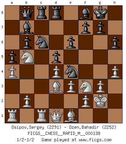 Last move : 1/2-1/2 2022 December 11 7:7:54 [Event "FICGS__CHESS__RAPID_M__000138"] [Site "FICGS"] [Date "2022.11.08"] [Round "1"] [White "Osipov,Sergey"] [Black "Ozen,Bahadir"] [Result "1/2-1/2"] [WhiteElo "2291"] [BlackElo "2252"] 1.d4 Nf6 2.c4 e6 3.Nf3 d5 4.g3 Bb4+ 5.Bd2 Be7 6.Bg2 O-O 7.O-O c6 8.Qc2 b6 9.Nc3 Nbd7 10.cxd5 cxd5 11.Qb3 Bb7 12.Rfc1 Rc8 13.e3 Rc4 14.Bf1 Qa8 15.a4 a5 16.Rcb1 R4c8 17.Nb5 Nb8 18.Qd1 Nc6 19.Rc1 h6 20.h4 Ne4 21.Be1 Qb8 22.Bd3 Rfe8 23.Nc3 Nf6 24.Nb5 Ne4 25.Kg2 Bf8 26.Bc3 Red8 27.Be1 Re8 28.Bc3 Red8 29.Be1 1/2-1/2 Follow this game move after move (download)A great player and a great example for many. His book My 60 Memorable Games had a big impact on me. It is a shame he didn't continue to enrich the world of chess with his unparalleled understanding after 1972. (Jan Timman, about Bobby Fischer's death) Das Zentrum ist der Balkan des Schachbretts - Kriegshandlungen können in jedem Moment ausbrechen. (Aaron Nimzowitsch) Aún el Rey más flojo huye despavorido ante la amenaza de un Jaque doble. (Aaron Nimzowitsch) Les échecs, c'est l'imagination. (David Bronstein) Computers are like Old Testament gods; lots of rules and no mercy. (Joseph Campbell)