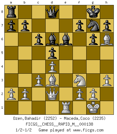 Last move : 1/2-1/2 2022 December 26 3:13:20 [Event "FICGS__CHESS__RAPID_M__000138"] [Site "FICGS"] [Date "2022.11.08"] [Round "1"] [White "Ozen,Bahadir"] [Black "Maceda,Coco"] [Result "1/2-1/2"] [WhiteElo "2252"] [BlackElo "2235"] 1.e4 e5 2.Nf3 Nc6 3.Bb5 Nf6 4.O-O Nxe4 5.Re1 Nd6 6.Nxe5 Be7 7.Bf1 Nxe5 8.Rxe5 O-O 9.d4 Bf6 10.Re1 Re8 11.Bf4 Rxe1 12.Qxe1 Ne8 13.c3 d5 14.Bd3 g6 15.Nd2 c6 16.Nf3 Ng7 17.Bh6 Be6 18.Qd2 Be7 19.Re1 Bd6 20.h3 1/2-1/2 Follow this game move after move (download)Life is like a game of Chess, changing with each move. (Chinese proverb) Man braucht nicht immer den besten Zug zu spielen: Ein Zug muß aktiv, unternehmungslustig, korrekt und schön sein. (David Bronstein) Robert Fischer es la ley hacia si mismo. (Larry Evans) Aux échecs, l'amour-propre est satisfait quand on remporte la victoire, mais il n'y a pas de honte à être battu. (Benjamin Franklin) Wisdom doesn't necessarily come with age. Sometimes age just shows up all by itself. (Tom Wilson)