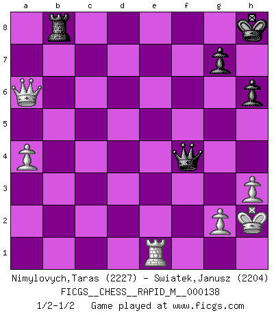 Last move : 1/2-1/2 2023 April 6 14:31:29 [Event "FICGS__CHESS__RAPID_M__000138"] [Site "FICGS"] [Date "2022.11.08"] [Round "1"] [White "Nimylovych,Taras"] [Black "Swiatek,Janusz"] [Result "1/2-1/2"] [WhiteElo "2227"] [BlackElo "2204"] 1.e4 e5 2.Nf3 Nc6 3.Bc4 Bc5 4.d3 d6 5.c3 Nf6 6.Nbd2 a6 7.b4 Ba7 8.O-O O-O 9.a4 h6 10.Re1 Ng4 11.Re2 Kh8 12.h3 f5 13.Bb3 Nf6 14.Nh4 Ne7 15.d4 Qe8 16.Re1 Nxe4 17.Nxe4 fxe4 18.Rxe4 Bd7 19.Ra2 Bc6 20.Rg4 Bd7 21.Re4 Bc6 22.Re1 Ng6 23.Bg5 Nxh4 24.Bxh4 Qg6 25.Bg3 Rae8 26.Bc2 Qf7 27.Bb3 Qg6 28.b5 Be4 29.bxa6 bxa6 30.Kh2 exd4 31.cxd4 c5 32.dxc5 dxc5 33.Bc4 Bb8 34.Qb3 Rd8 35.Rae2 Bd3 36.Re6 Bxc4 37.Qxc4 Qg5 38.Qb3 c4 39.Qxc4 Rxf2 40.Re8+ Rf8 41.Rxf8+ Rxf8 42.Bxb8 Rxb8 43.Qxa6 Qf4+ 1/2-1/2 Follow this game move after move (download)Chess is a part of culture and if a culture is declining then Chess too will decline. (Mikhail Botvinnik) Wenn Du nicht kämpfst, um anderen etwas zu beweisen, sondern nur für Dich selbst, dann bist du fast unbesiegbar. (Garry Kasparov) Si un gobernante no entiende al Ajedrez, ¿como puede governar él un reinado?. (El Rey Khusros II) J'apprécie les joueurs d'est-indienne, c'est grâce à eux que je nourris ma famille depuis tant d'années. (Petrosian) He who defends everything defends nothing. (Frederick the Great)