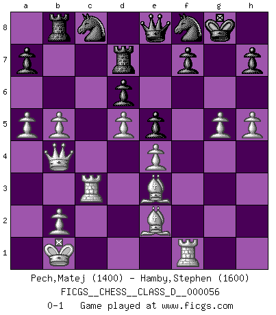 Last move : 0-1 2008 October 23 0:34:17 [Event "FICGS__CHESS__CLASS_D__000056"] [Site "FICGS"] [Date "2007.08.16"] [Round "1"] [White "Pech,Matej"] [Black "Hamby,Stephen"] [Result "0-1"] [WhiteElo "1400"] [BlackElo "1600"] 1.d4 c5 2.d5 Nf6 3.c4 Ne4 4.Qc2 Qa5+ 5.Nd2 Nf6 6.e4 d6 7.Ne2 e5 8.Nc3 Be7 9.Be2 Nbd7 10.Nf1 O-O 11.Bd2 Re8 12.Ne3 Nf8 13.g4 Ng6 14.g5 Nd7 15.Ng2 Nb8 16.h4 Na6 17.O-O-O Nb4 18.Qb1 Na6 19.h5 Nf8 20.Nh4 Bd7 21.Nf5 Rab8 22.Nxe7+ Rxe7 23.f4 Qd8 24.f5 b5 25.f6 Re8 26.fxg7 Kxg7 27.Nxb5 Bxb5 28.cxb5 Nc7 29.a4 Kg8 30.Rdf1 Re7 31.Bc4 Qc8 32.Qd3 Na8 33.Rf6 Qd7 34.Qc2 Nb6 35.Be2 Qc7 36.Kb1 Nfd7 37.a5 Nc8 38.Rf2 Nf8 39.Qb3 c4 40.Bxc4 Qc5 41.Be3 Qc7 42.Qb4 Qd7 43.Be2 Qe8 44.Rc1 Qd7 45.Rc3 Qe8 46.Rf1 Rd7 0-1 This chess game has been lost on time (started : 2007.08.16 14:41:58) Old Benoni defense Kingside Castling by player Black (move 10) Queenside Castling by player White (move 17) Player Black won this chess game. Follow this game move after move (download)In Chess, as it is played by masters, chance is practically eliminated. (Emanuel Lasker) Ich war zu klein für die Schach-Schülermannschaft! (Woody Allen) Bendita sea la memoria de aquel que dio al mundo este juego inmortal. (A. G. Gardiner) On n'a jamais que l'âge auquel on a commence à jouer aux échecs car après on cesse de vieillir. (Capablanca) Knowledge rests not upon truth alone, but upon error also. (Carl G. Jung)