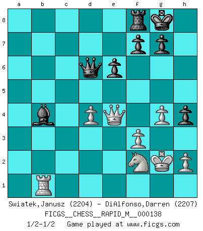 Last move : 1/2-1/2 2022 December 16 15:52:53 [Event "FICGS__CHESS__RAPID_M__000138"] [Site "FICGS"] [Date "2022.11.08"] [Round "1"] [White "Swiatek,Janusz"] [Black "DiAlfonso,Darren"] [Result "1/2-1/2"] [WhiteElo "2204"] [BlackElo "2207"] 1.Nf3 d5 2.d4 Nf6 3.c4 e6 4.g3 Bb4+ 5.Bd2 Be7 6.Bg2 c6 7.Bc3 dxc4 8.Ne5 b5 9.Nxc6 Nxc6 10.Bxc6+ Bd7 11.Bxa8 Qxa8 12.f3 h5 13.O-O h4 14.g4 b4 15.Be1 Nd5 16.Qc1 Qb8 17.a3 a5 18.axb4 axb4 19.Nd2 c3 20.Ne4 Nf4 21.Rf2 Nh3+ 22.Kg2 Nxf2 23.Nxf2 Bb5 24.Qc2 cxb2 25.Qxb2 O-O 26.Bxb4 Bxe2 27.Rb1 Bxb4 28.Qxe2 Qd6 29.Qe4 1/2-1/2 Follow this game move after move (download)If Chess is a science, it's a most inexact one. If Chess is an art, it is too exacting to be seen as one. If Chess is a sport, it's too esoteric. If Chess is a game, it's too demanding to be just a game. If Chess is a mistress, she's a demanding one. If Chess is a passion, it's a rewarding one. If Chess is life, it's a sad one. (Unknown) Der Freibauer hat für mich eine Seele, genau wie der Mensch, Wünsche, die unerkannt in ihm schlummern, und Befürchtungen, von deren Existenz er selbst kaum ahnt. (Aaron Nimzowitsch) Hay dos clases de hombres: aquellos que se conforman en dejarse llevar por las circunstancias y que juegan barajas y aquellos decididos a controlar las circunstancias y que juegan al Ajedrez. (Mortimer Collins) Une platitude souvent récitée à propos des Echecs est qu'une des choses les plus difficiles à réaliser est de gagner une position gagnante. Cela ne manque pas de sens mais, pour ma part, j'ai toujours trouvé plus difficile de gagner une position perdante. (Tim Krabbe) I've never seen so many men wasted so badly. (Blondie in The Good, The Bad and The Ugly)