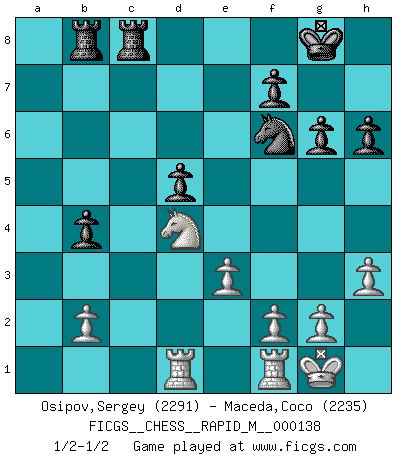 Last move : 1/2-1/2 2023 January 13 4:33:26 [Event "FICGS__CHESS__RAPID_M__000138"] [Site "FICGS"] [Date "2022.11.08"] [Round "1"] [White "Osipov,Sergey"] [Black "Maceda,Coco"] [Result "1/2-1/2"] [WhiteElo "2291"] [BlackElo "2235"] 1.d4 d5 2.c4 e6 3.Nc3 Nf6 4.cxd5 exd5 5.Bg5 c6 6.e3 h6 7.Bh4 Be7 8.Qc2 O-O 9.Bd3 Re8 10.Nge2 Nbd7 11.O-O Nf8 12.Rab1 a5 13.h3 Nh5 14.Bxe7 Qxe7 15.Rbe1 Qd8 16.a3 Ne6 17.Qd2 b6 18.Rc1 Qe7 19.Na4 Rb8 20.Bf5 Ng5 21.Qd3 Bxf5 22.Qxf5 g6 23.Qc2 Rec8 24.Nac3 Ne6 25.Rcd1 Nf6 26.Nc1 Qd6 27.Qd2 c5 28.N1e2 b5 29.dxc5 Qxc5 30.Nd4 b4 31.axb4 axb4 32.Nce2 Nxd4 33.Qxd4 Qxd4 34.Nxd4 1/2-1/2 Follow this game move after move (download)Nonsense was the last thing Fischer was interested in, as far as Chess was concerned. (Elie Agur) Was ist der Unterschied zwischen einem Strassenarbeiter und einem Schachspieler? --Der Schachspieler bewegt sich ab und zu. (Anonymous) Todo se encuentra en un estado de flujo y esto incluye al mundo del Ajedrez. (Mikhail Botvinnik) Un journaliste : 'Vous préférez avoir une dame de plus sur l'échiquier ou au lit ?' Boris Spassky : 'Ca dépend de la position.' If only people were all showed a certain minimum level of niceness; if only people didn't retract verbal draw offers (without draw box ticked) on ficgs; if only people didn't kill; if only people didn't run concentration / extermination camps, if only people didn't drop nuclear bombs on Hiroshima and Nagasaki, and so on - it would be a much more beautiful world. But sadly, things are not so... (Normajean Yates)