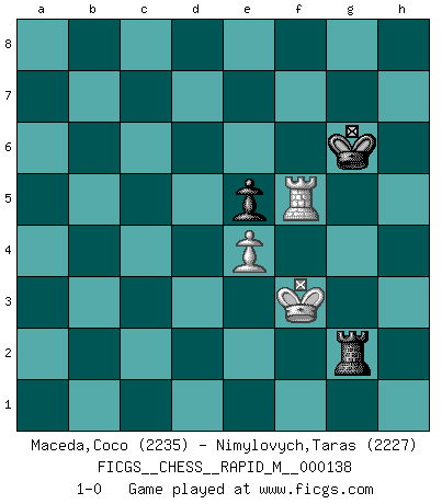 Last move : 1-0 2023 April 23 14:19:24 [Event "FICGS__CHESS__RAPID_M__000138"] [Site "FICGS"] [Date "2022.11.08"] [Round "1"] [White "Maceda,Coco"] [Black "Nimylovych,Taras"] [Result "1-0"] [WhiteElo "2235"] [BlackElo "2227"] 1.d4 Nf6 2.Nf3 e6 3.c4 d5 4.g3 Bb4+ 5.Bd2 Be7 6.Bg2 O-O 7.O-O Nbd7 8.c5 Ne4 9.Nc3 f5 10.a4 a5 11.Bf4 Nef6 12.Nb5 Ne8 13.Qc1 c6 14.Na3 Nef6 15.Nc2 b6 16.b4 Ne4 17.Ne5 Nxe5 18.Bxe5 Bd7 19.cxb6 Qxb6 20.bxa5 Qxa5 21.Bxe4 fxe4 22.h4 c5 23.dxc5 Qxc5 24.Nd4 Qxc1 25.Rfxc1 Bf6 26.Bxf6 gxf6 27.Rc7 Rf7 28.Rc5 e5 29.Nb5 Bxb5 30.Rxb5 d4 31.Kg2 Rc7 32.a5 Ra6 33.e3 d3 34.Rb6 Rca7 35.Rxa6 Rxa6 36.g4 h5 37.gxh5 Kh7 38.f3 d2 39.Rd1 Rxa5 40.Rxd2 exf3+ 41.Kxf3 Ra4 42.Rd6 Rxh4 43.Rxf6 Rxh5 44.Kg4 Rh2 45.e4 Kg7 46.Rf1 Kg6 47.Rf5 Rg2+ 48.Kf3 1-0 This chess game has been lost on time (started : 2022.11.08 18:29:48) Follow this game move after move (download)Bobby Fischer is the greatest Chess genius of all time ! (Alexander Kotov) Ein Großmeister muß tausende Partien in seinem Kopf speichern, denn diese sind für Ihn, was die Worte der Muttersprache für gewöhnliche Leute sind, oder Noten für Musiker... (Garry Kasparov) No hay precio que sea tan grande por la cabellera del Rey enemigo. (Koblentz) Le génie consiste à savoir transgresser les règles au moment opportun. (Teichmann) Lottery : A tax on people who are bad at math. (Author unknown)