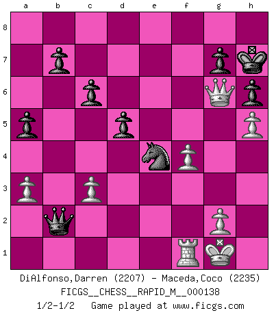 Last move : 1/2-1/2 2023 January 19 6:24:31 [Event "FICGS__CHESS__RAPID_M__000138"] [Site "FICGS"] [Date "2022.11.08"] [Round "1"] [White "DiAlfonso,Darren"] [Black "Maceda,Coco"] [Result "1/2-1/2"] [WhiteElo "2207"] [BlackElo "2235"] 1.e4 e5 2.Nf3 Nc6 3.Bb5 Nf6 4.O-O Nxe4 5.Re1 Nd6 6.Nxe5 Be7 7.Bf1 Nxe5 8.Rxe5 O-O 9.d4 Bf6 10.Re1 Re8 11.Bf4 Rxe1 12.Qxe1 Ne8 13.c3 d5 14.Nd2 Bf5 15.Qe2 c6 16.Nb3 Nd6 17.Re1 h6 18.Qf3 Bg6 19.Nc5 Ne4 20.Nd3 a5 21.a3 Qb6 22.Re2 Re8 23.Ne5 Bxe5 24.Bxe5 Qb3 25.h4 Re6 26.h5 Ng5 27.Qg4 Bd3 28.Re1 Bxf1 29.f4 Qxb2 30.Rxf1 Rxe5 31.Qc8+ Kh7 32.dxe5 Ne4 33.Qf5+ Kg8 34.e6 fxe6 35.Qxe6+ Kh8 36.Qe8+ Kh7 37.Qg6+ 1/2-1/2 Follow this game move after move (download)The Pawns are the soul of the game. (Francois Andre Danican Philidor) Über Frauen: Chess is better. (Robert James Fischer) El Rey es una pieza de pelea. ¡Usenlo!. (Wilhelm Steinitz) Je ne crois pas en la psychologie, je crois aux bons coups. (Robert Fischer) Life doesn't imitate art, it imitates bad television. (Woody Allen)