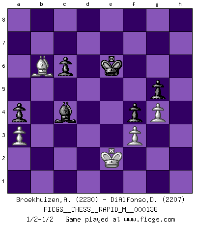 Last move : 1/2-1/2 2023 January 2 9:40:57 [Event "FICGS__CHESS__RAPID_M__000138"] [Site "FICGS"] [Date "2022.11.08"] [Round "1"] [White "Broekhuizen,A. T. S."] [Black "DiAlfonso,Darren"] [Result "1/2-1/2"] [WhiteElo "2230"] [BlackElo "2207"] 1.e4 e5 2.Nf3 Nc6 3.Bb5 Nf6 4.O-O Nxe4 5.d4 Nd6 6.Bxc6 dxc6 7.dxe5 Nf5 8.Qxd8+ Kxd8 9.h3 Be7 10.Rd1+ Ke8 11.Nbd2 Nh4 12.Nxh4 Bxh4 13.Nb3 h5 14.Bf4 Be7 15.Nd4 g5 16.Bh2 Rh6 17.Rd3 Kf8 18.Rad1 c5 19.Nb5 Bf5 20.R3d2 Rc8 21.c4 a6 22.Nc3 c6 23.f3 b5 24.Kf2 Be6 25.Ne4 Bxc4 26.Nd6 Bxd6 27.exd6 Rd8 28.b3 Bd5 29.Re1 Re8 30.Rde2 Rxe2+ 31.Rxe2 Re6 32.d7 Rxe2+ 33.Kxe2 Ke7 34.Bd6+ Kxd7 35.Bxc5 f5 36.g4 hxg4 37.hxg4 f4 38.Bb4 Ke6 39.Bc5 a5 40.Bd4 a4 41.bxa4 bxa4 42.a3 Bb3 43.Bb6 Bc4+ 1/2-1/2 Follow this game move after move (download)When you don't know what to do, wait for your opponent to get an idea - it's sure to be wrong. (Tarrasch) Ich verstehe mehr vom Schach als irgendein anderer lebender Meister. (José Raúl Capablanca) Robert Fischer es la ley hacia si mismo. (Larry Evans) Un millionnaire : 'Monsieur Steinitz ! Vous ne participez aux tournois que pour l'argent, alors que moi je n'y viens que pour l'honneur.' Steinitz : 'Chacun joue pour ce qu'il n'a pas'... Sometimes it pays to stay in bed in Monday, rather than spending the rest of the week debugging Monday's code. (Dan Salomon)