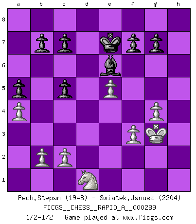 Last move : 1/2-1/2 2023 March 11 17:38:23 [Event "FICGS__CHESS__RAPID_A__000289"] [Site "FICGS"] [Date "2022.11.13"] [Round "1"] [White "Pech,Stepan"] [Black "Swiatek,Janusz"] [Result "1/2-1/2"] [WhiteElo "1948"] [BlackElo "2204"] 1.e4 e5 2.Nf3 Nc6 3.Bb5 Nf6 4.O-O Nxe4 5.d4 Nd6 6.Bxc6 dxc6 7.dxe5 Nf5 8.Qxd8+ Kxd8 9.Nc3 Ke8 10.h3 a5 11.Rd1 Be7 12.g4 Nh4 13.Nxh4 Bxh4 14.Kg2 Ke7 15.Bf4 h5 16.f3 Be6 17.a4 Rad8 18.Bg3 hxg4 19.hxg4 Bxg3 20.Kxg3 Bd5 21.Rd2 Be6 22.Rad1 Rxd2 23.Rxd2 Rh1 24.Rd1 Rxd1 25.Nxd1 c5 1/2-1/2 Follow this game move after move (download)Live, lose, and learn, by observing your opponent how to win. (Amber Steenbock) Ich würde die 30 stärksten Spieler der USA im Simultanspiel besiegen. (José Raúl Capablanca) Nos gusta pensar. (Gary Kasparov) On a dit que l'homme se distingue de l'animal par le fait qu'il achète plus de livres qu'il ne peut en lire. Je voudrais suggérer qu'inclure à la liste des livres quelques livres d'échecs rendrait la distinction manifeste. (Edward Lasker) Follow your passion, and success will follow you. (Arthur Buddhold)