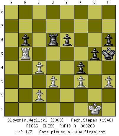Last move : 1/2-1/2 2023 March 1 15:19:51 [Event "FICGS__CHESS__RAPID_A__000289"] [Site "FICGS"] [Date "2022.11.13"] [Round "1"] [White "Slawomir,Weglicki"] [Black "Pech,Stepan"] [Result "1/2-1/2"] [WhiteElo "2009"] [BlackElo "1948"] 1.e4 e5 2.Nf3 Nc6 3.Nc3 Nf6 4.Bb5 Bb4 5.O-O O-O 6.d3 d6 7.Bg5 Ne7 8.Bc4 Bxc3 9.bxc3 Ng6 10.Nh4 Nf4 11.Rb1 Ne6 12.Bxe6 fxe6 13.Qe2 b6 14.f4 exf4 15.e5 dxe5 16.Qxe5 Ng4 17.Bxd8 Nxe5 18.Bxc7 Nf7 19.Nf3 g5 20.c4 Bb7 21.Rfe1 Bxf3 22.gxf3 Rac8 23.Be5 Rc6 24.a4 Nxe5 25.Rxe5 h6 26.a5 Rf5 27.R1b5 Rxe5 28.Rxe5 Kf7 29.axb6 axb6 30.Rb5 Kg6 31.Kf2 Rd6 32.h3 Kh5 33.Kg1 1/2-1/2 Follow this game move after move (download)The tactician must know what to do whenever something needs doing; the strategist must know what to do when nothing needs doing. (Savielly Tartakover) Alles was am Schachbrett zählt sind gute Züge. (Robert James Fischer) Tu no necesitas jugar muy bien, únicamente ayudar a tu oponenet a que juegue muy mal. (Genrikh Chepukaitis) Je ne suis pas le dernier à jouer lâchement des coups douteux pendant le zeïtnot de l'adversaire pour l'achever: en effet les coups qui font le plus peur sont ceux que l'on ne comprend pas. Je me fais souvent peur quand je joue. (Un professeur anonyme) There are lots of people who mistake their imagination for their memory. (Josh Bilings)