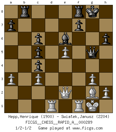 Last move : 1/2-1/2 2023 January 28 21:38:26 [Event "FICGS__CHESS__RAPID_A__000289"] [Site "FICGS"] [Date "2022.11.13"] [Round "1"] [White "Hepp,Henrique"] [Black "Swiatek,Janusz"] [Result "1/2-1/2"] [WhiteElo "1900"] [BlackElo "2204"] 1.c4 e5 2.g3 Nf6 3.Bg2 c6 4.Nc3 d5 5.d4 e4 6.a3 Be7 7.f3 exf3 8.Nxf3 O-O 9.O-O h6 10.Bf4 dxc4 11.Qc2 Nd5 12.e4 Nxc3 13.bxc3 Be6 14.Qb2 b6 15.Ne5 Bd6 16.Nf3 Be7 17.Ne5 Qc8 18.Qe2 Nd7 19.Ng4 Nc5 20.Nxh6+ gxh6 21.dxc5 Bxc5+ 22.Be3 Qd8 23.Bxc5 bxc5 24.e5 Rb8 25.Rad1 Qg5 1/2-1/2 Follow this game move after move (download)Everything is in a state of flux, and this includes the world of Chess. (Mikhail Botvinnik) Bobby Fischer ist kein Vorbild für die heutige Jugend. (Viktor Kortschnoi) El Ajedrez lo es todo: arte, ciencia y deporte. (Anatoly Karpov) La tactique est l'élément le plus important du milieu de jeu. (Siegbert Tarrasch) The best weapon against an enemy is another enemy. (Friedrich Nietzsche)