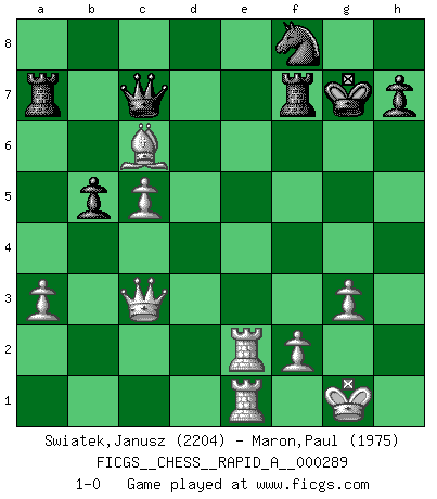 Last move : 1-0 2023 February 4 19:41:19 [Event "FICGS__CHESS__RAPID_A__000289"] [Site "FICGS"] [Date "2022.11.13"] [Round "1"] [White "Swiatek,Janusz"] [Black "Maron,Paul"] [Result "1-0"] [WhiteElo "2204"] [BlackElo "1975"] 1.Nf3 Nf6 2.d4 d5 3.c4 e6 4.g3 Be7 5.Bg2 O-O 6.O-O c6 7.b3 b6 8.Nc3 Ba6 9.Nd2 b5 10.c5 Bb7 11.a3 Nbd7 12.Bb2 a5 13.Qc2 e5 14.dxe5 Ng4 15.b4 Ngxe5 16.e4 d4 17.Nd1 Nf6 18.Re1 Ba6 19.Nb3 d3 20.Qc3 d2 21.Re2 Nc4 22.Nxa5 Nxa5 23.Rxd2 Qc7 24.bxa5 Bc8 25.Ne3 Rxa5 26.e5 Ng4 27.Nc2 f6 28.Qb3+ Kh8 29.exf6 Bxf6 30.Re1 Ra8 31.Nb4 Bb7 32.h3 Ne5 33.Rde2 Ng6 34.h4 Bxb2 35.Qxb2 Rf7 36.h5 Nf8 37.h6 Kg8 38.Qb3 Kh8 39.Nxc6 Bxc6 40.Bxc6 Ra7 41.hxg7+ Kxg7 42.Qc3+ 1-0 Follow this game move after move (download)Chess is a fairy tale of 1001 blunders. (Savielly Tartakower) Wenn Du einsam bist, wenn Du Dich in der Welt wie ein Fremder fühlst, spiele Schach. Das wird Deinen Geist erheben und Dein Ratgeber im Kampf sein. (Aristoteles) Siempre es mejor sacrificar los hombres de tu oponente. (Savielly Tartakower) Votre seul travail dans les ouvertures est d'obtenir un milieu de partie jouable. (Lajos Portish) Experience is the name we all give to our mistakes. (Oscar Wilde)