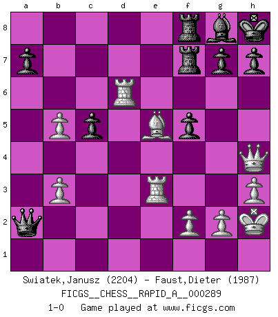 Last move : 1-0 2023 January 6 9:30:36 [Event "FICGS__CHESS__RAPID_A__000289"] [Site "FICGS"] [Date "2022.11.13"] [Round "1"] [White "Swiatek,Janusz"] [Black "Faust,Dieter"] [Result "1-0"] [WhiteElo "2204"] [BlackElo "1987"] 1.Nf3 Nf6 2.d4 d5 3.c4 c6 4.Nc3 e6 5.e3 Nbd7 6.Bd3 Bd6 7.e4 dxe4 8.Nxe4 Nxe4 9.Bxe4 e5 10.O-O exd4 11.Bc2 O-O 12.Qxd4 Bc5 13.Qe4 f5 14.Qe6+ Kh8 15.Bd2 Nf6 16.Qe5 Bd6 17.Qd4 c5 18.Qh4 Ne4 19.Ng5 Nxg5 20.Bxg5 Qb6 21.Rad1 Be6 22.Rfe1 Bg8 23.b3 Qa5 24.h3 Rf7 25.Re3 Qxa2 26.Rxd6 Qxc2 27.Bf4 Raf8 28.Kh2 b5 29.cxb5 Qa2 30.Be5 1-0 Follow this game move after move (download)It was clear to me that the vulnerable point of the American Grandmaster (Bobby Fischer) was in double-edged, hanging, irrational positions, where he often failed to find a win even in a won position. (Efim Geller) Ich trinke, ich rauche, ich spiele, ich liebe Frauen aber Fernschach ist ein Laster, das ich nicht habe. (Mikhail Nekhemyevich Tal) Ser exitoso en el Ajedrez te permite descubrir tu propia personalidad. Eso es lo que deseo para los niños de mi clase. (Saudin Robovic) Les échecs c'est le défi de l'alpiniste, toujours plus haut, prêt à tout pour monter à l'assaut du Roi ennemi. Les échecs, c'est de la musique en mouvement, un ballet majestueux pour les yeux. C'est de la poésie composée par les fantômes du passé qui au même titre que Rimbaud ou Verlaine méritent notre admiration. Les échecs, c'est de la peinture ou le moindre mouvement modifie le tableau pour en faire un Picasso ou un Van Gogh. Les échecs, c'est tout et rien, c'est la vie et la mort. Jjulie33 sur le forum de France-Echecs. The bottom line is always the bottom line. (Johann Piek)
