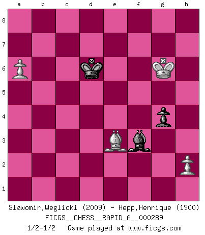 Last move : 1/2-1/2 2023 February 18 15:16:8 [Event "FICGS__CHESS__RAPID_A__000289"] [Site "FICGS"] [Date "2022.11.13"] [Round "1"] [White "Slawomir,Weglicki"] [Black "Hepp,Henrique"] [Result "1/2-1/2"] [WhiteElo "2009"] [BlackElo "1900"] 1.e4 c5 2.Nf3 e6 3.d4 cxd4 4.Nxd4 a6 5.Bd3 Qc7 6.O-O Nf6 7.Qe2 d6 8.f4 Nbd7 9.c4 Be7 10.Nc3 O-O 11.Kh1 b6 12.b4 Bb7 13.a3 Rfe8 14.Bb2 Bf8 15.Rad1 Rad8 16.Bc2 g6 17.b5 Nc5 18.bxa6 Bxa6 19.Ncb5 Qb7 20.e5 Nfe4 21.exd6 Bg7 22.Bxe4 Qxe4 23.Qxe4 Nxe4 24.Nc7 Bxc4 25.Nxe8 Bxf1 26.Nc6 Bb5 27.Nxd8 Nf2+ 28.Kg1 Nxd1 29.Bxg7 Bxe8 30.Bd4 Kf8 31.Bxb6 Nc3 32.Kf2 Bb5 33.Bc7 Ke8 34.Nb7 Bc6 35.Nc5 Ne4+ 36.Nxe4 Bxe4 37.g4 h6 38.Ke3 Bb7 39.Kd4 f6 40.g5 hxg5 41.fxg5 e5+ 42.Kc5 fxg5 43.Ba5 Kd7 44.Bc3 e4 45.Bd2 g4 46.a4 Bc8 47.Kd5 Bb7+ 48.Kc5 Bc8 49.a5 Bb7 50.Bf4 Ba8 51.a6 Bc6 52.Kd4 Ba8 53.Ke5 Bc6 54.Kf6 e3 55.Bxe3 Kxd6 56.Kxg6 Bf3 1/2-1/2 Follow this game move after move (download)Some part of a mistake is always correct. (Savielly Tartakover) Der Traum, für den ich lebe, ist der von einem freien Russland. Viele mögen sagen: Russland hat doch ein Parlament, einen gewählten Präsidenten. Aber ich spüre, dass in meiner Heimat die Angst wiederkehrt. Eine Angst, sich frei zu äußern, bestimmte Dinge zu tun (Garry Kasparov) Todos los jugadores de Ajedrez deberían tener un pasatiempo. (Savielly Tartakower) C'est la seule position que je connaisse où les deux camps sont mals. Propos prêtés à V. Anand. The best teachers teach from the heart, not from the book. (Author unknown)