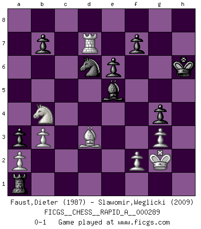 Last move : 0-1 2023 January 2 9:7:0 [Event "FICGS__CHESS__RAPID_A__000289"] [Site "FICGS"] [Date "2022.11.13"] [Round "1"] [White "Faust,Dieter"] [Black "Slawomir,Weglicki"] [Result "0-1"] [WhiteElo "1987"] [BlackElo "2009"] 1.c4 g6 2.Nc3 c5 3.e3 Nf6 4.d4 cxd4 5.exd4 d5 6.Qb3 Bg7 7.cxd5 O-O 8.Nge2 a5 9.g3 a4 10.Qa3 Nxd5 11.Bg2 Nb6 12.O-O Nc6 13.d5 Ne5 14.Rd1 Nbc4 15.Qb4 Qd6 16.Qxd6 Nxd6 17.Bf4 h6 18.Rac1 g5 19.Bxe5 Bxe5 20.Rd2 Bg4 21.Nd1 Rfc8 22.Ne3 Bxe2 23.Rxc8+ Rxc8 24.Rxe2 Rc1+ 25.Bf1 Bd4 26.b3 a3 27.Nc2 Bb2 28.Nb4 Bc3 29.Nd3 Ra1 30.Kg2 Kg7 31.Rc2 Bb2 32.Nb4 g4 33.Be2 h5 34.Rc7 Nf5 35.d6 Nxd6 36.Bd3 e6 37.h3 Kh6 38.hxg4 hxg4 39.Rd7 Be5 0-1 Follow this game move after move (download)Bobby just drops the pieces and they fall on the right squares. (Miguel Najdorf) Ich bin Weltmeister und muß mit niemandem irgend etwas diskutieren. (Viswanathan Anand) Los tropiezos estan todos ahí en el tablero, esperando que se cometan. (Savielly Tartakover) Les Echecs, c'est l'art de la guerre sans les charniers, c'est la résurrection des morts tombés au champ d'honneur, l'espoir perpétuel, la suprématie de l'intelligence sur la force, la culture de l'esprit. (F. Szpiner) Lamb in skin of tiger, still fears the wolf. (Chinese proverb)