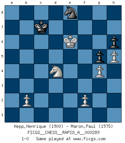Last move : 1-0 2023 April 12 12:16:31 [Event "FICGS__CHESS__RAPID_A__000289"] [Site "FICGS"] [Date "2022.11.13"] [Round "1"] [White "Hepp,Henrique"] [Black "Maron,Paul"] [Result "1-0"] [WhiteElo "1900"] [BlackElo "1975"] 1.c4 e6 2.Nc3 d5 3.d4 Nf6 4.Nf3 c5 5.e3 a6 6.cxd5 exd5 7.Be2 c4 8.O-O b5 9.a4 b4 10.Nxd5 Qxd5 11.e4 Qb7 12.Bxc4 Be7 13.Qb3 Nc6 14.Bxf7+ Kf8 15.a5 Bg4 16.Be3 Rd8 17.d5 Bd6 18.Be6 Bxe6 19.dxe6 Qb5 20.Bb6 Ke7 21.Rfd1 Nxe4 22.Qe3 Nf6 23.Rac1 Rhg8 24.h3 Rc8 25.Bc5 Bxc5 26.Rxc5 Qb8 27.Qg5 g6 28.Rcd5 Rcd8 29.Rd7+ Rxd7 30.exd7 Kf7 31.Qc5 Qb5 32.Ng5+ Kg7 33.Ne6+ Kh8 34.Qxb5 axb5 35.d8Q Nxd8 36.Rxd8 Rxd8 37.Nxd8 Nd5 38.a6 Kg7 39.a7 Nb6 40.Nc6 Kf6 41.Nxb4 Na8 42.Nd5+ Ke5 43.Nc3 b4 44.Na2 Kd5 45.Nxb4+ Kc4 46.Nc2 Kc5 47.h4 Kb6 48.Kh2 Kxa7 49.Kg3 Nc7 50.Kf4 h6 51.Ke5 Ne8 52.g4 Kb6 53.Nd4 Kc7 54.Ke6 g5 55.h5 1-0 Follow this game move after move (download)The way he plays Chess demonstrates a man's whole nature. (Stanley Ellin) Mit Schach schule ich mein Gefühl für Geometrie, was für Tennis und Schach gleichermaßen wichtig ist. (Boris Becker) Un mal plan es mejor que no tener ningún plan. (Frank Marshall) Toutes choses étant égales, c'est la conviction qui gagne. Alliée à une volonté de vaincre, elle sert de détonateur, suscite des idées, disperse les doutes et aide à penser clairement. (Robert Fischer) Looking at the proliferation of personal web pages on the Net, it looks like very soon everyone on Earth will have 15 megabytes of fame. (M.G. Sriram)