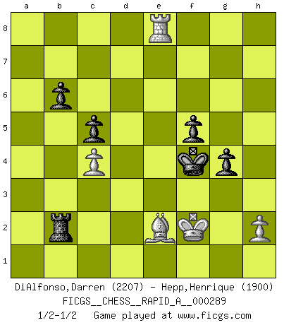 Last move : 1/2-1/2 2023 March 19 22:16:41 [Event "FICGS__CHESS__RAPID_A__000289"] [Site "FICGS"] [Date "2022.11.13"] [Round "1"] [White "DiAlfonso,Darren"] [Black "Hepp,Henrique"] [Result "1/2-1/2"] [WhiteElo "2207"] [BlackElo "1900"] 1.d4 Nf6 2.c4 e6 3.g3 Bb4+ 4.Bd2 a5 5.Bg2 O-O 6.Nf3 Be7 7.O-O c6 8.Qc2 d5 9.Rd1 Nbd7 10.Bf4 a4 11.a3 Ne4 12.Nc3 Nxc3 13.bxc3 dxc4 14.Nd2 g5 15.Be3 Nb6 16.Nf3 Ra5 17.Rab1 Nd5 18.Bd2 f6 19.e4 Nc7 20.Ra1 g4 21.Ne1 h5 22.Be3 f5 23.Qe2 fxe4 24.Bxe4 Nd5 25.Qxc4 Nxe3 26.fxe3 h4 27.Ng2 Rh5 28.gxh4 Bxh4 29.Rf1 Be7 30.Nf4 Rh6 31.Ng6 Rxf1+ 32.Qxf1 Bd6 33.Ne5 Bxe5 34.dxe5 Qg5 35.Qf4 Qxf4 36.exf4 Kf7 37.Rd1 Ke7 38.c4 c5 39.Rd3 b6 40.Bc6 Ba6 41.Rd7+ Kf8 42.Rd8+ Ke7 43.Rd7+ Kf8 44.f5 exf5 45.Bd5 Ke8 46.Ra7 Bc8 47.Ra8 Kd7 48.e6+ Kc7 49.e7 Bd7 50.e8B Bxe8 51.Rxe8 Rh3 52.Re7+ Kd8 53.Ra7 Rxa3 54.Bc6 Rc3 55.Rxa4 Kc7 56.Bg2 Kd6 57.Bf1 Ke5 58.Ra1 Rb3 59.Be2 Kf4 60.Ra8 Rb1+ 61.Kf2 Rb2 62.Ke1 Rb1+ 63.Kf2 Rb2 64.Rb8 Ke4 65.Re8+ Kf4 66.Kg1 Rb1+ 67.Kf2 Rb2 68.Kg1 Rb1+ 69.Kf2 Rb2 1/2-1/2 Follow this game move after move (download)He who takes the Queen's Knight's Pawn will sleep in the streets. (Anonymous) Besser ein falscher Plan, logisch durchgeführt, als gar kein Plan. (Viktor Kortschnoi) Un juego de Ajedrez es un dialogo, una conversación entre un jugador y su oponente. Cada movimiento del oponente puede contener amenazas o tropiezos, pero un jugador no se puede defender de las amenazas o tomar ventaja de los tropiezos si es que no se pregunta a sí mismo: ¿Que es lo que mi oponente va a hacer después de cada movida?. (Bruce A. Moon) Mais l'homme est une créature légère et illogique : semblable au joueur d'échecs, il n'aime que le processus du but à atteindre, non le but lui-même. (Dostoïevsky) Before all elsed, be armed. (Niccolo Machiavelli)