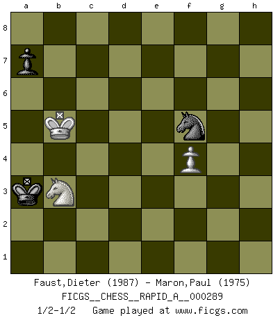 Last move : 1/2-1/2 2023 January 31 13:25:31 [Event "FICGS__CHESS__RAPID_A__000289"] [Site "FICGS"] [Date "2022.11.13"] [Round "1"] [White "Faust,Dieter"] [Black "Maron,Paul"] [Result "1/2-1/2"] [WhiteElo "1987"] [BlackElo "1975"] 1.c4 e6 2.Nc3 d5 3.d4 Nf6 4.cxd5 Nxd5 5.e4 Nxc3 6.bxc3 c5 7.Nf3 cxd4 8.cxd4 Bb4+ 9.Bd2 Bxd2+ 10.Qxd2 O-O 11.Rc1 b6 12.Bd3 Bb7 13.O-O Nd7 14.Qe3 Nf6 15.Ne5 Rc8 16.Rxc8 Qxc8 17.Rc1 Qa8 18.f3 Rc8 19.Bb5 h6 20.a4 Rxc1+ 21.Qxc1 Qd8 22.Qc3 g5 23.Qd2 Kg7 24.h4 Ng8 25.hxg5 hxg5 26.Qc3 f6 27.Ng4 Nh6 28.Ne3 g4 29.Kf2 gxf3 30.gxf3 Nf7 31.d5 exd5 32.exd5 Kf8 33.f4 Nd6 34.Qd3 Qc7 35.Qd4 Qc3 36.Qd3 Qxd3 37.Bxd3 Ke7 38.Kf3 Bc8 39.Nd1 Nf5 40.Nc3 Kd6 41.Ne4+ Kxd5 42.Nxf6+ Kd4 43.Bb5 Nd6 44.Bd7 Bxd7 45.Nxd7 Kc4 46.Ke3 Kc3 47.Ne5 Kb3 48.Kd4 Kxa4 49.Kd5 Nf5 50.Kc6 b5 51.Nd3 Ka5 52.Nc1 b4 53.Nb3+ Ka4 54.Nc5+ Ka3 55.Kb5 b3 56.Nxb3 1/2-1/2 Follow this game move after move (download)All I want to do, ever, is just play Chess. (Bobby Fischer) Ein typischer, sehr verbreiteter Gedankenschädling ist der, daß der betreffende Amateur von der Annanhme ausgeht, daß jeder einzelne Zug etwas zu leisten habe. (Aaron Nimzowitsch) Cuando tu casa esta en llamas, no puedes ser molestado por tus vecinos. O, como decinos en Ajedrez, si tu Rey esta bajo ataque, no te preocupa perder un Peón del lado de la Reina. (Gary Kasparov) J'ai vu le vaincu d'Echecs jouer des années durant dans l'espoir de la fête de la victoire. Car tu es plus riche de ce qu'elle existe si même elle n'est point pour toi. Ainsi de la perle du fond des mers. (Antoine de Saint-Exupéry) Creativity involves breaking out of established patterns in order to look at things in a different way. (Edward De Bono)