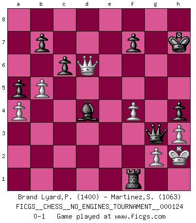 Last move : 0-1 2022 December 13 23:33:8 [Event "FICGS__CHESS__NO_ENGINES_TOURNAMENT__000124"] [Site "FICGS"] [Date "2022.11.13"] [Round "1"] [White "Brand Lyard,Paul"] [Black "Martinez,Silvio"] [Result "0-1"] [WhiteElo "1400"] [BlackElo "1063"] 1.d4 d5 2.Nc3 Nf6 3.Bg5 h6 4.Bxf6 exf6 5.e3 Nc6 6.Bb5 Bd7 7.Bxc6 Bxc6 8.Nf3 Bb4 9.O-O O-O 10.Ne2 Re8 11.c3 Ba5 12.b4 Bb6 13.a4 a5 14.b5 Bd7 15.Qb3 Be6 16.Nf4 Rb8 17.Nh4 g5 18.Nxe6 Rxe6 19.Qc2 gxh4 20.Qf5 Qd7 21.f4 Rd8 22.Qh5 Rxe3 23.Qxh6 Rxc3 24.Qxf6 Qg4 25.Qxd8+ Kg7 26.Qxd5 c6 27.Qe5+ Kg6 28.Qd6+ Kh7 29.Rae1 Rd3 30.Re7 Bxd4+ 31.Kh1 Rd1 32.R7e1 Rxe1 33.h3 Rxf1+ 34.Kh2 Qg3+ 0-1 Follow this game move after move (download)We must make sure that Chess will not be like a dead language, very interesting, but for a very small group. (Sytze Faber) Der 70jährige Viktor Kortschnoi: Die Rentenanstalt wollte mich zwingen in Rente zu gehen. Meine Frau erhält jetzt eine Pension- und ich zahle weiter in die Rentenkasse ein! (Viktor Kortschnoi) Ayuda a tus piezas para que ellas te puedan ayudar. (Paul Morphy) Le plus grand jeu de l'esprit jamais inventé, plus vous l'apprenez, plus vous y prenez du plaisir. (Garry Kasparov) The greatest con, that he ever pulled... was making you believe... that he is you. (Revolver, movie)