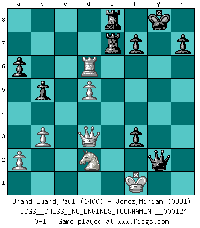 Last move : 0-1 2022 December 13 23:28:47 [Event "FICGS__CHESS__NO_ENGINES_TOURNAMENT__000124"] [Site "FICGS"] [Date "2022.11.13"] [Round "1"] [White "Brand Lyard,Paul"] [Black "Jerez,Miriam"] [Result "0-1"] [WhiteElo "1400"] [BlackElo "0991"] 1.c4 Nf6 2.d4 d5 3.Qa4+ Bd7 4.Qb4 b6 5.Bg5 Nc6 6.Qb3 Nxd4 7.Qc3 Ne6 8.Bxf6 exf6 9.cxd5 Nc5 10.e3 Bf5 11.Bc4 Ne4 12.Qd4 Bc5 13.Qd1 O-O 14.f3 Nd6 15.b3 Bxe3 16.g4 Bg6 17.h4 Re8 18.Kf1 b5 19.Bd3 Bxd3+ 20.Qxd3 Bxg1 21.Rxg1 a6 22.h5 g5 23.h6 c5 24.f4 gxf4 25.g5 fxg5 26.Nd2 Qf6 27.Kf2 Qxh6 28.Rac1 Qh4+ 29.Kf1 Re7 30.Rxc5 f3 31.Rxg5+ Qxg5 32.Rc6 Rae8 33.Rxd6 Qg2+ 0-1 Follow this game move after move (download)A bad day of Chess is better than any good day at work. (Anonymous) Bis jetzt ist Weiß einer wohlbekannten Analyse gefolgt. Aber jetzt begeht er einen schrecklichen Fehler: Er beginnt seinen eigenen Kopf zu benutzen. (Siegbert Tarrasch) El sobresalir en el Ajedrez es un signo de una mente intrigante. (Sir Arthur Conan Doyle) Pour se monter efficace, un Cavalier a besoin d'avant-postes ! Les Cavaliers font les meilleurs bloqueurs de pions passés. The faster the computer, the slower the brain. (Thibault de Vassal)