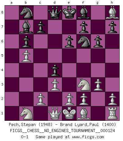 Last move : 0-1 2023 February 23 11:6:31 [Event "FICGS__CHESS__NO_ENGINES_TOURNAMENT__000124"] [Site "FICGS"] [Date "2022.11.13"] [Round "1"] [White "Pech,Stepan"] [Black "Brand Lyard,Paul"] [Result "0-1"] [WhiteElo "1948"] [BlackElo "1400"] 1.b4 d5 2.Bb2 e6 3.b5 a6 4.a4 axb5 5.axb5 Rxa1 6.Bxa1 b6 7.Nf3 g6 8.Bxh8 Nf6 9.g3 Bb7 10.d3 d4 0-1 Follow this game move after move (download)If Chess is a science, it's a most inexact one. If Chess is an art, it is too exacting to be seen as one. If Chess is a sport, it's too esoteric. If Chess is a game, it's too demanding to be just a game. If Chess is a mistress, she's a demanding one. If Chess is a passion, it's a rewarding one. If Chess is life, it's a sad one. (Unknown) Der Vorposten provoziert a) eine Basis für neue Angriffe und b) eine Schwächung der gegnerischen Widerstandskraft in der fraglichen Linie. (Aaron Nimzowitsch) Sin errores no puede haber brillantez. (Emanuel Lasker) On est toujours la mazette de quelqu'un d'autre. (Anonyme) Crush them ! Make them suffer ! (General Grievous in Star Wars ep.3)