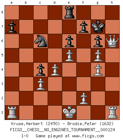 Last move : 1-0 2022 November 18 8:36:36 [Event "FICGS__CHESS__NO_ENGINES_TOURNAMENT__000124"] [Site "FICGS"] [Date "2022.11.13"] [Round "1"] [White "Kruse,Herbert"] [Black "Brodie,Peter"] [Result "1-0"] [WhiteElo "2490"] [BlackElo "1632"] 1.e4 e6 2.d4 d5 3.e5 c5 4.c3 c4 5.b3 b5 6.a4 Bd7 7.axb5 Bxb5 8.Na3 Bxa3 9.Bxa3 Ne7 10.Nf3 O-O 11.h4 Nbc6 12.Ng5 h6 13.bxc4 Bxc4 14.Bxc4 dxc4 15.Qc2 hxg5 16.hxg5 g6 17.Qe4 Qd5 18.Qh4 Qe4+ 19.Qxe4 Kg7 20.Qf3 Nf5 21.Bxf8+ Rxf8 22.Qh3 Re8 23.g4 Nh6 24.Qxh6+ 1-0 Follow this game move after move (download)Suddenly it was obvious to me in my analysis I had missed what Fischer had found with the greatest of ease at the board. (Mikhail Botvinnik) Der zweitbeste Zug ist oft der einzig richtige. (Savielly Grigorievitsch Tartakower) El tablero es el mundo, las piezas es el fenomeno del universo, las reglas del juego son lo que llamamos leyes de la naturaleza y el jugador del lado opuesto, se encuentra oculto a nuestra vista. (Thomas Huxley) La tactique est l'élément le plus important du milieu de jeu. (Siegbert Tarrasch) The intuitive mind is a sacred gift; the rational mind is a faithful servant. We have created a society that honors the servant but has forgotten the gift. (Albert Einstein)