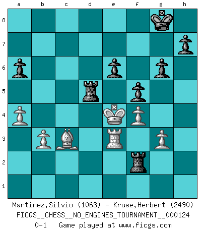 Last move : 0-1 2022 November 27 19:23:42 [Event "FICGS__CHESS__NO_ENGINES_TOURNAMENT__000124"] [Site "FICGS"] [Date "2022.11.13"] [Round "1"] [White "Martinez,Silvio"] [Black "Kruse,Herbert"] [Result "0-1"] [WhiteElo "1063"] [BlackElo "2490"] 1.e4 c5 2.Nf3 d6 3.d4 cxd4 4.Nxd4 Nf6 5.Nd2 Nc6 6.Nxc6 bxc6 7.g3 Qa5 8.Bd3 Bh3 9.b3 Bg2 10.Rg1 Bxe4 11.Kf1 Bxd3+ 12.cxd3 g6 13.Nc4 Qd5 14.f3 Bg7 15.Bb2 O-O 16.d4 Rfe8 17.Ne3 Qg5 18.Bc1 Nd5 19.f4 Nxe3+ 20.Bxe3 Qb5+ 21.Qe2 Qxe2+ 22.Kxe2 c5 23.dxc5 Bxa1 24.Rxa1 dxc5 25.Bxc5 Rec8 26.Bd4 Rc2+ 27.Kd3 Rxh2 28.Re1 e6 29.a4 Rg2 30.Re3 a6 31.Bc3 Rd8+ 32.Ke4 Rf2 33.Ba5 Rd5 34.Bc3 f5+ 0-1 Follow this game move after move (download)The enormous mental resilience, without which no Chess player can exist, was so much taken up by Chess that he could never free his mind of this game. (Albert Einstein) Nie in meinem Leben habe ich die französische Verteidigung gespielt, welche die Stumpfsinnigste von allen ist. (Wilhelm Steinitz) Solo los afeminados hacen el Enroque. (Rob Sillars) Le thème de l'attaque double intervient d'une manière ou d'une autre dans l'immense majorité des combinaisons. (Youri Averbakh) It's not the will to win, but the will to prepare to win that makes the difference. (Bear Bryant)