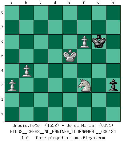 Last move : 1-0 2023 May 12 5:34:4 [Event "FICGS__CHESS__NO_ENGINES_TOURNAMENT__000124"] [Site "FICGS"] [Date "2022.11.13"] [Round "1"] [White "Brodie,Peter"] [Black "Jerez,Miriam"] [Result "1-0"] [WhiteElo "1632"] [BlackElo "0991"] 1.Nf3 Nc6 2.d4 Nf6 3.c4 d5 4.c5 e6 5.Nc3 g6 6.Bf4 b6 7.cxb6 cxb6 8.e3 Bb4 9.Bb5 Bb7 10.O-O a6 11.Ba4 O-O 12.Qc2 b5 13.Bb3 Re8 14.a3 Bd6 15.Be5 Ng4 16.Bxd6 Qxd6 17.h3 Nf6 18.Rae1 e5 19.dxe5 Nxe5 20.Nxe5 Qxe5 21.f4 Qf5 22.Qxf5 gxf5 23.Bc2 Bc8 24.Rf2 d4 25.Nd1 Ne4 26.Bxe4 Rb8 27.Bd3 dxe3 28.Rxe3 Rxe3 29.Nxe3 Bd7 30.Nd5 Kg7 31.Re2 Rd8 32.Kf2 Be6 33.Nb4 h6 34.Re5 Rd4 35.Ke3 Rd6 36.Bxf5 Bxf5 37.Rxf5 Kg6 38.Rd5 Re6+ 39.Re5 Rf6 40.Nd5 Rd6 41.Ke4 f6 42.f5+ Kg5 43.Re6 Rd8 44.Rxa6 Re8+ 45.Re6 Rf8 46.g3 Rf7 47.h4+ Kg4 48.Rxf6 Rxf6 49.Nxf6+ Kxg3 50.h5 Kh4 51.b3 Kg5 52.Nd5 Kxh5 53.f6 Kg6 54.Ke5 Kf7 55.Nc7 h5 56.Nxb5 h4 57.Nd4 h3 58.Nf3 Kg6 59.b4 1-0 Follow this game move after move (download)It is no time to be playing Chess when the house is on fire. (Italian Proverb) Moralische Siege zählen nicht. (Savielly Grigorievitsch Tartakower) Desconfianza es la característica mas necesaria de un jugador de Ajedrez. (Siegbert Tarrasch) Les sacrifices démontrent seulement que quelqu'un a gaffé. (Savielly Tartacover) There's no money in correspondence chess. (John Knudsen)