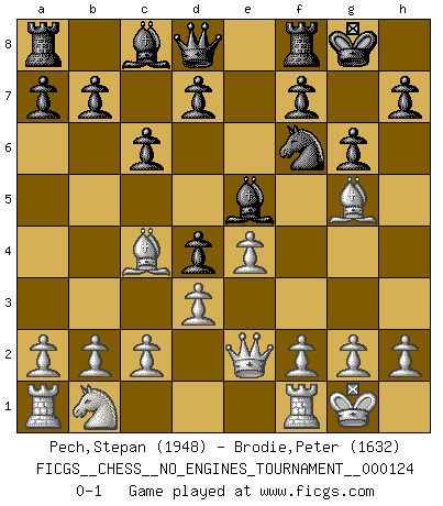 Last move : 0-1 2023 February 23 16:8:59 [Event "FICGS__CHESS__NO_ENGINES_TOURNAMENT__000124"] [Site "FICGS"] [Date "2022.11.13"] [Round "1"] [White "Pech,Stepan"] [Black "Brodie,Peter"] [Result "0-1"] [WhiteElo "1948"] [BlackElo "1632"] 1.e4 e5 2.Nf3 Nc6 3.Bb5 Nd4 4.Nxd4 exd4 5.O-O c6 6.Bc4 Bd6 7.Qh5 g6 8.Qe2 Be5 9.d3 Nf6 10.Bg5 O-O 0-1 Follow this game move after move (download)Do you realize Fischer almost never has any bad pieces? He exchanges them, and the bad pieces remain with his opponents. (Yuri Balashov) Ich habe die besten Aussichten, den ersten Preis zu gewinnen - denn jeder muss gegen Steinitz spielen, nur ich nicht! (Wilhelm Steinitz) Yo tuve un dolor de muelas en la primer partida. En el segundo juego, tuve un dolor de cabeza. En el tercero, tuve un ataque de reumatísmo. En la cuarta partida, no me sentía muy bien. ¿Y en el quinto juego? Bueno, ¿que acaso uno tiene que ganar todos los juegos?. (Siegbert Tarrasch) Vous savez, camarade Pachman, je n'éprouve pas de plaisir à être ministre, je jouerais plutôt aux échecs comme vous, ou alors ferais une révolution au Venezuela. (Che Guevara à Ludek Pachman, 'Checkmate in Prague', 1975) Good luck. You're gonna need it. (Han Solo in Star Wars ep.6)