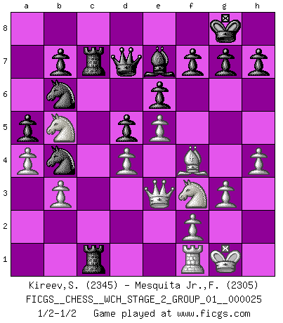 Last move : 1/2-1/2 2023 January 28 22:48:45 [Event "FICGS__CHESS__WCH_STAGE_2_GROUP_01__000025"] [Site "FICGS"] [Date "2022.11.15"] [Round "1"] [White "Kireev,Sergey"] [Black "Mesquita Jr.,Fausto Monteiro"] [Result "1/2-1/2"] [WhiteElo "2345"] [BlackElo "2305"] 1.e4 c6 2.d4 d5 3.e5 Bf5 4.Be2 e6 5.c3 c5 6.Nf3 Nc6 7.O-O Bg6 8.a3 cxd4 9.cxd4 Nge7 10.h3 Nc8 11.Bd3 Bxd3 12.Qxd3 a5 13.b3 Nb6 14.Nc3 Be7 15.Rb1 O-O 16.a4 Nc8 17.Bf4 Nb4 18.Qe3 Ra6 19.Rbc1 Rc6 20.Ne2 Nb6 21.g3 Qd7 22.h4 Rfc8 23.Nc3 R8c7 24.Nb5 Rxc1 1/2-1/2 Follow this game move after move (download)The hardest game to win is a won game. (Emanuel Lasker) Warum muß ich gegen diesen IDIOTEN verlieren? (Aaron Nimzowitsch) Una compensación adecuada por un sacrificio es tener una combinación sólida que conduce a una posición ganadora; una compensación adecuada por una metida de pata es dejar a tu oponente arrebatar una derrota de las fauces de la victoria. (Bruce A. Moon) Même si vous avez un bon coup à faire, regardez toujours s'il n'y en a pas un qui lui soit préférable. (Pedro Damiano) Question: Is 'This statement is paradoxical' a paradoxical statement ? Or is it a meta-paradox ? (Normajean Yates)