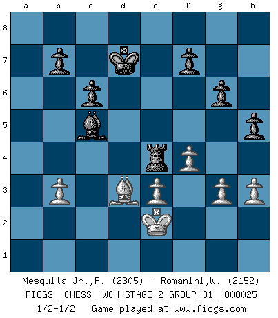 Last move : 1/2-1/2 2023 February 17 18:42:58 [Event "FICGS__CHESS__WCH_STAGE_2_GROUP_01__000025"] [Site "FICGS"] [Date "2022.11.15"] [Round "1"] [White "Mesquita Jr.,Fausto Monteiro"] [Black "Romanini,William"] [Result "1/2-1/2"] [WhiteElo "2305"] [BlackElo "2152"] 1.Nf3 Nf6 2.c4 g6 3.Nc3 d5 4.cxd5 Nxd5 5.Qb3 Nb6 6.d4 Bg7 7.Bf4 Be6 8.Qa3 Nc6 9.e3 a5 10.Qc5 O-O 11.Be2 a4 12.Nb5 Ra5 13.Qc1 Nd5 14.Bg3 Bg4 15.Nc3 Re8 16.Nxd5 Rxd5 17.O-O e5 18.dxe5 Nxe5 19.Bxe5 Rdxe5 20.h3 Bxf3 21.Bxf3 c6 22.Rb1 Rb5 23.Qc2 Qa5 24.Rfd1 Bf6 25.g3 Rc5 26.Qe2 Qb5 27.Qxb5 Rxb5 28.b4 axb3 29.Rxb3 Rxb3 30.axb3 Re5 31.Rd7 Re7 32.Rd6 Kg7 33.Kg2 h5 34.Be2 Bc3 35.Kf3 Kf8 36.Rd3 Ba5 37.Rd1 Ke8 38.Bd3 Bc3 39.Rc1 Bb4 40.Rc4 Bd6 41.Ke2 Kd7 42.f4 Re8 43.Ra4 Bc5 44.Re4 Rxe4 1/2-1/2 Follow this game move after move (download)Spassky will not be psyched out by Fischer. (Mike Goodall) Wenn ich Weiß habe gewinne ich weil ich Weiß habe, wenn ich Schwarz habe gewinne ich weil ich Bogoljubov bin. (Efim Bogoljubov) Yo no le temo a Spassky. Todos saben que yo soy el mejor. Uno no necesita un torneo para probarlo. (Bobby Fischer) J'ai toujours senti une vague pitié pour l'homme qui ne connaît rien aux échecs, tout comme j'en aurais pour un homme ignorant de l'amour. Les Echecs, comme la musique ou comme l'amour, ont le pouvoir de rendre heureux. (Siegbert Tarrasch) They say in chess you've got to kill the queen, and then you mate it... Oh I, do you ? (Red Hot Chili Peppers, Fortune faded)