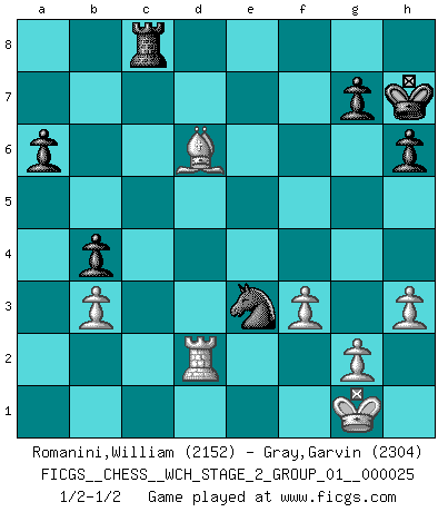 Last move : 1/2-1/2 2023 January 23 22:30:54 [Event "FICGS__CHESS__WCH_STAGE_2_GROUP_01__000025"] [Site "FICGS"] [Date "2022.11.15"] [Round "1"] [White "Romanini,William"] [Black "Gray,Garvin"] [Result "1/2-1/2"] [WhiteElo "2152"] [BlackElo "2304"] 1.d4 d5 2.c4 c6 3.Nc3 Nf6 4.e3 e6 5.Nf3 Nbd7 6.Qc2 Bd6 7.Bd3 O-O 8.O-O dxc4 9.Bxc4 a6 10.Rd1 b5 11.Bd3 Qc7 12.Bd2 c5 13.Ne4 c4 14.Nxd6 Qxd6 15.Be2 Bb7 16.b3 Bd5 17.Rdc1 Rfc8 18.Qb2 Ne4 19.Be1 f6 20.Rc2 Rab8 21.Rac1 Nb6 22.Ba5 h6 23.Ne1 f5 24.f3 Nf6 25.Bf1 Kh7 26.Rb1 Nfd7 27.Rf2 e5 28.dxe5 Qxe5 29.Nc2 Qxb2 30.Rxb2 Bg8 31.Rb1 Ne5 32.Nd4 Nc6 33.Nxc6 Rxc6 34.h3 cxb3 35.axb3 Nd5 36.Bd3 b4 37.Bxf5+ Kh8 38.Bd3 Nxe3 39.Re1 Nd5 40.Rd2 Nf4 41.Be4 Rc5 42.Bd8 Rd5 43.Rxd5 Nxd5 44.Ba5 Nc3 45.Bc2 Bh7 46.Bc7 Rc8 47.Bxh7 Kxh7 48.Bd6 Nd5 49.Rd1 Ne3 50.Re1 Nd5 51.Rd1 Ne3 52.Rd2 1/2-1/2 Follow this game move after move (download)Dazzling combinations are for the many, shifting wood is for the few. (Georg Kieninger) Später, ... hatte ich zunehmend Erfolg in entscheidenden Partien. Vielleicht weil ich eine einfache Wahrheit erkannte: nicht nur ich hatte Angst, auch mein Gegner. (Mikhail Nekhemyevich Tal) El jugador táctico sabe que hacer cuando hay algo que hacer; mientras que el estratega sabe que hacer cuando no hay nada que hacer. (Gerald Abrahams) Mais l'homme est une créature légère et illogique : semblable au joueur d'échecs, il n'aime que le processus du but à atteindre, non le but lui-même. (Dostoïevsky) The ego is not master in its own house. (Sigmund Freud)