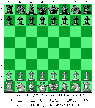 Last move : 0-1 2022 December 16 0:27:25 [Event "FICGS__CHESS__WCH_STAGE_2_GROUP_01__000025"] [Site "FICGS"] [Date "2022.11.15"] [Round "1"] [White "Flores,Luis"] [Black "Bussoli,Marco"] [Result "0-1"] [WhiteElo "2245"] [BlackElo "2183"] 0-1 This chess game has been lost on time (started : 2022.11.15 23:18:2) Follow this game move after move (download)Before the endgame, the Gods have placed the middle game. (Siegbert Tarrasch) Es hat in meinem Leben Zeiten gegeben, da ich sehr nahe daran war zu glauben, daß ich auch nicht eine einzige Schachpartie verlieren könnte. (José Raúl Capablanca) Existen dos clases de sacrificios: los correctos y los míos. (Mikhail Tal) Le joueur d'Echecs qui veut atteindre le top est obligé de développer son propre credo créatif. Alexeï Stepanovicth Souétine. Il est facile d'écrire des livres ! Ce qui est difficile, c'est de jouer ! (Alexeï Stepanovicth Souétine) In fact if nothing is done against this teddy bear, hereby I announce that I would quit chess, rapid chess, blitz chess, postal chess, email chess, server chess and correspondence chess I will then switch to a table game where teddy bears aren't going to be seen for a while, like Poker, or Roulette, all 18+ games. (Elmer Valderrama)