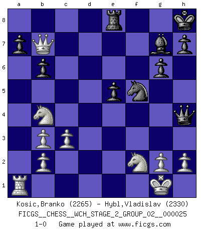 Last move : 1-0 2023 March 29 7:46:58 [Event "FICGS__CHESS__WCH_STAGE_2_GROUP_02__000025"] [Site "FICGS"] [Date "2022.11.15"] [Round "1"] [White "Kosic,Branko"] [Black "Hybl,Vladislav"] [Result "1-0"] [WhiteElo "2265"] [BlackElo "2330"] 1.e4 c5 2.Nc3 d6 3.f4 g6 4.Nf3 Nc6 5.Bc4 Bg7 6.O-O e6 7.d4 cxd4 8.Nb5 Nge7 9.Bb3 O-O 10.Nbxd4 Na5 11.Be3 b6 12.c3 Ba6 13.Rf2 Nxb3 14.axb3 Bb7 15.f5 Qd7 16.fxg6 fxg6 17.Qd3 e5 18.Nc2 d5 19.Nb4 Qg4 20.Nd2 Rxf2 21.Bxf2 dxe4 22.Qc4+ Kh8 23.Qc7 e3 24.Qxb7 exf2+ 25.Kf1 Re8 26.Ne4 Nf5 27.Nxf2 Qh4 28.Kg1 1-0 Follow this game move after move (download)I prefer to lose a really good game than to win a bad one. (David Levy) Jede Eröffnung ist gut genug um gespielt zu werden, wenn nur ihr Ruf schlecht genug ist. (Savielly Grigorievitsch Tartakower) ¿Cual es el objetivo de jugar una apertura de gambito?... Para adquirir una reputación de ser un jugador apuesto a costo de perder el juego. (Siegbert Tarrasch) Nous vivons dans un monde échiquéen : chaque jour qui passe est un défi à relever. (Philosophe Sasha) Tomorrow's what you make of it. (Horatio Caine, C.S.I. Miami)