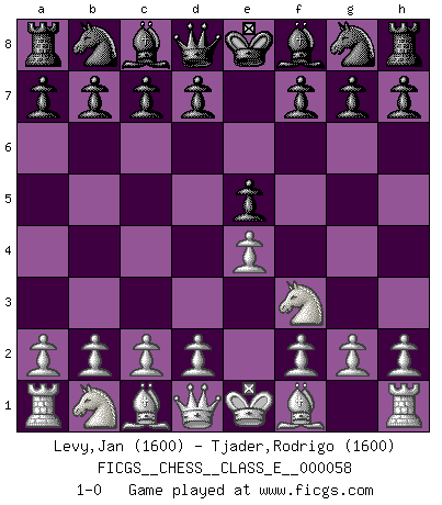 Last move : 1-0 2007 September 29 10:28:39 [Event "FICGS__CHESS__CLASS_E__000058"] [Site "FICGS"] [Date "2007.08.17"] [Round "1"] [White "Levy,Jan"] [Black "Tjader,Rodrigo"] [Result "1-0"] [WhiteElo "1600"] [BlackElo "1600"] 1.e4 e5 2.Nf3 1-0 This chess game has been lost on time (started : 2007.08.17 4:41:10) King's knight Opening Player White won this chess game. Follow this game move after move (download)The combination player thinks forward; he starts from the given position, and tries the forceful moves in his mind. (Emanuel Lasker) Mit Schach schule ich mein Gefühl für Geometrie, was für Tennis und Schach gleichermaßen wichtig ist. (Boris Becker) Vive, pierde y aprende al observar a tu oponente como ganar. (Amber Steenbock) L'attaque fait le spectacle, la défense gagne les matchs. (Dicton footballistique) Luck never gives; it only lends. (Swedish proverb)