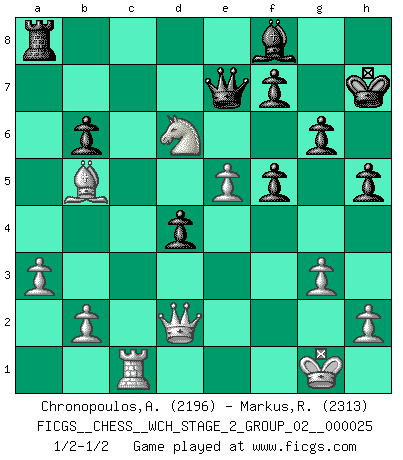 Last move : 1/2-1/2 2023 January 17 10:54:51 [Event "FICGS__CHESS__WCH_STAGE_2_GROUP_02__000025"] [Site "FICGS"] [Date "2022.11.15"] [Round "1"] [White "Chronopoulos,Antonis"] [Black "Markus,Roland"] [Result "1/2-1/2"] [WhiteElo "2196"] [BlackElo "2313"] 1.d4 d5 2.c4 c6 3.Nf3 Nf6 4.Nc3 e6 5.Bg5 h6 6.Bxf6 Qxf6 7.e3 Nd7 8.Be2 g6 9.O-O Qe7 10.e4 dxc4 11.Nd2 Bg7 12.Nxc4 O-O 13.e5 Rd8 14.f4 Nb6 15.Nxb6 axb6 16.a3 b5 17.Qd2 Bf8 18.Ne4 c5 19.Nf6+ Kh8 20.Bxb5 Rxd4 21.Qc2 b6 22.Rad1 Bb7 23.Rxd4 cxd4 24.Rc1 h5 25.g3 Kg7 26.Qd2 Qd8 27.f5 exf5 28.Ne8+ Kh8 29.Nd6 Qe7 30.Nxb7 Kh7 31.Nd6 1/2-1/2 Follow this game move after move (download)Chess is like life. (Boris Spassky) Warum muß ich gegen diesen IDIOTEN verlieren? (Aaron Nimzowitsch) Yo no creo en la psicología. Yo creo en las buenas movidas. (Bobby Fischer) On entre au jeu d'Echecs comme on entre en Religion. Pour le joueur d'Echecs, la partie d'Echecs c'est l'office, la messe, le défilé du 1er Mai, le dépôt de gerbe au Monument aux Morts. C'est un drame sacré. (Michel Roos) All politicians must be presumed guilty until they are proven innocent. (Dinesh De Silva)