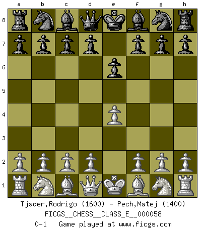 Last move : 0-1 2007 September 27 22:15:23 [Event "FICGS__CHESS__CLASS_E__000058"] [Site "FICGS"] [Date "2007.08.17"] [Round "1"] [White "Tjader,Rodrigo"] [Black "Pech,Matej"] [Result "0-1"] [WhiteElo "1600"] [BlackElo "1400"] 1.e4 e6 0-1 This chess game has been lost on time (started : 2007.08.17 4:41:10) French defense Player Black won this chess game. Follow this game move after move (download)Good offense and good defense both begin with good development. (Bruce A. Moon) Schach ist ein Kampf gegen den Fehler. (Johannes Herrman Zukertort) Tu no necesitas jugar muy bien, únicamente ayudar a tu oponenet a que juegue muy mal. (Genrikh Chepukaitis) Une platitude souvent récitée à propos des Echecs est qu'une des choses les plus difficiles à réaliser est de gagner une position gagnante. Cela ne manque pas de sens mais, pour ma part, j'ai toujours trouvé plus difficile de gagner une position perdante. (Tim Krabbe) Patience, use the Force, think ! (Obi-Wan Kenobi in Star Wars ep.2)