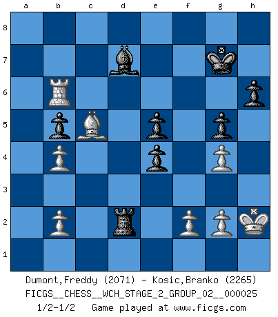 Last move : 1/2-1/2 2023 March 26 23:56:23 [Event "FICGS__CHESS__WCH_STAGE_2_GROUP_02__000025"] [Site "FICGS"] [Date "2022.11.15"] [Round "1"] [White "Dumont,Freddy"] [Black "Kosic,Branko"] [Result "1/2-1/2"] [WhiteElo "2071"] [BlackElo "2265"] 1.e4 c5 2.Nf3 Nc6 3.d4 cxd4 4.Nxd4 Nf6 5.Nc3 e5 6.Ndb5 d6 7.Nd5 Nxd5 8.exd5 Nb8 9.c4 Be7 10.c5 O-O 11.Bd3 Na6 12.cxd6 Bxd6 13.O-O Nb4 14.Be4 f5 15.Nxd6 Qxd6 16.a3 fxe4 17.axb4 Bf5 18.h3 Rf7 19.Qb3 Qg6 20.Kh2 h6 21.Re1 b6 22.Be3 Raf8 23.Rg1 Qh5 24.d6 Kh8 25.Qc3 Bg4 26.Qc2 Rf3 27.Rh1 Bf5 28.Kg1 Qg6 29.Qc7 Rf7 30.Qd8+ Kh7 31.Qh4 Bd7 32.Kh2 R3f6 33.Rhd1 Bc6 34.Qg4 Qxg4 35.hxg4 Rd7 36.Ra3 g5 37.Kg3 Kg6 38.Kh2 R7xd6 39.Rxd6 Rxd6 40.Rxa7 Bd7 41.Rb7 b5 42.Bc5 Rd2 43.Rb6+ Kg7 44.Be3 Rd5 45.Bc5 Rd2 46.Be3 Rd3 47.Bc5 Rd2 1/2-1/2 Follow this game move after move (download)Is Bobby Fischer quite sane ? (Salo Flohr) Stil? Ich habe keinen Stil! (Anatoly Karpov) Buenas posiciones no logran ganar juegos, buenas movidas sí. (Gerald Abrahams) Karpov est une pièce de musée. (Garry Kasparov) Luck has a peculiar habit of favoring those who don't depend on it. (Author unknown)