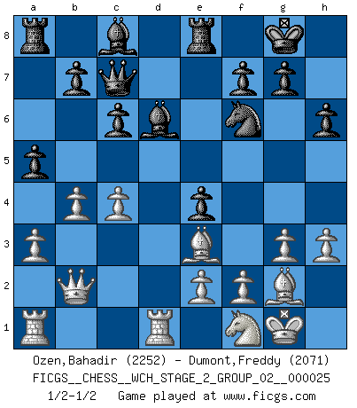 Last move : 1/2-1/2 2022 December 20 10:23:30 [Event "FICGS__CHESS__WCH_STAGE_2_GROUP_02__000025"] [Site "FICGS"] [Date "2022.11.15"] [Round "1"] [White "Ozen,Bahadir"] [Black "Dumont,Freddy"] [Result "1/2-1/2"] [WhiteElo "2252"] [BlackElo "2071"] 1.d4 Nf6 2.c4 c6 3.Bf4 Qb6 4.Qd2 Ne4 5.Qc2 d6 6.Nc3 Nxc3 7.Qxc3 Nd7 8.Nf3 e5 9.Be3 Qc7 10.g3 Be7 11.Bg2 O-O 12.O-O Re8 13.Rfd1 Bf8 14.a3 Nf6 15.dxe5 dxe5 16.b4 a5 17.h3 h6 18.Qb2 e4 19.Nd2 Bd6 20.Nf1 1/2-1/2 Follow this game move after move (download)Many Chess players were surprised when after the game, Fischer quietly explained: 'I had already analyzed this possibility' in a position which I thought was not possible to foresee from the opening. (Mikhail Tal) Wie kann ich Remis annehmen? Ich weiß ja gar nicht, wie ich stehe! (Fritz Sämisch) No hay un Gran Maestro de Ajedrez que sea normal; solo se diferencían ellos por la magnitud de su locura. (Viktor Korchnoi) Le jeu d'échecs est comme rejeté hors du temps. (Antoine de Saint-Exupéry) All war is based on deception. (Sun Tzu)