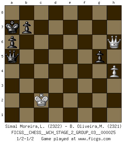 Last move : 1/2-1/2 2023 February 15 21:13:52 [Event "FICGS__CHESS__WCH_STAGE_2_GROUP_03__000025"] [Site "FICGS"] [Date "2022.11.15"] [Round "1"] [White "Simal Moreira,Leonardo"] [Black "B. Oliveira,Marcio"] [Result "1/2-1/2"] [WhiteElo "2322"] [BlackElo "2321"] 1.e4 c5 2.Nf3 d6 3.d4 cxd4 4.Nxd4 Nf6 5.Nc3 a6 6.f3 e5 7.Nb3 Be6 8.Be3 h5 9.Qd2 Nbd7 10.Nd5 Bxd5 11.exd5 g6 12.O-O-O Nb6 13.Kb1 Nbxd5 14.Bg5 Be7 15.Bd3 Qc7 16.Rhe1 Nb6 17.a4 O-O-O 18.a5 Nbd7 19.Be3 Kb8 20.Bg1 d5 21.h3 Rhe8 22.c3 Nc5 23.Bc2 Nxb3 24.Bxb3 Bc5 25.Bh2 Bd6 26.Qg5 Re6 27.g4 hxg4 28.fxg4 e4 29.Bxd5 Nxd5 30.Rxd5 Rde8 31.Rxd6 Rxd6 32.Qf4 R8e6 33.Rxe4 g5 34.Qf3 Rxe4 35.Qxe4 Rd1+ 36.Kc2 Qxh2+ 37.Kxd1 Qxb2 38.Qe8+ Ka7 39.Qe3+ Ka8 40.Qxg5 Qxc3 41.h4 Qf3+ 42.Kd2 Qf2+ 43.Kc3 f6 44.Qh5 Ka7 45.g5 Qf5 46.Kb3 Qb1+ 47.Kc3 Qf5 48.Qh6 Qxa5+ 49.Kc2 fxg5 1/2-1/2 Follow this game move after move (download)Fischer is an American Chess tragedy on par with Morphy and Pillsbury. (Mig Greengard) Im Hotelzimmer gab es nur zwei Schaben. (Über die Turnierbedingungen) (Peter Swidler) La señal de un Gran Maestro es su habilidad de ganar una partida rápidamente y sin dolor. (Irving Chernev) Nous vivons dans un monde échiquéen : chaque jour qui passe est un défi à relever. (Philosophe Sasha) Wisdom is the reward you get for a lifetime of listening when you'd have preferred to talk. (Doug Larson)