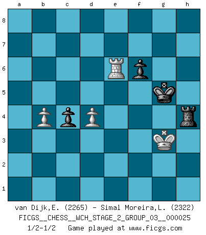 Last move : 1/2-1/2 2023 May 6 15:42:38 [Event "FICGS__CHESS__WCH_STAGE_2_GROUP_03__000025"] [Site "FICGS"] [Date "2022.11.15"] [Round "1"] [White "van Dijk,Erik L."] [Black "Simal Moreira,Leonardo"] [Result "1/2-1/2"] [WhiteElo "2265"] [BlackElo "2322"] 1.e4 c5 2.Nc3 Nc6 3.f4 g6 4.Nf3 Bg7 5.Bb5 Nd4 6.Bc4 Nh6 7.d3 e6 8.O-O O-O 9.h3 b6 10.Nb5 Nxb5 11.Bxb5 a6 12.Ba4 b5 13.Bb3 d5 14.c3 c4 15.Bc2 Qb6+ 16.d4 dxe4 17.Bxe4 Rb8 18.Ne5 Nf5 19.Qe1 Re8 20.a4 Ne7 21.h4 f6 22.Nf3 h5 23.Qe2 Bb7 24.Bxb7 Rxb7 25.axb5 axb5 26.Nd2 Nf5 27.Ne4 Rbe7 28.Kh2 Nxh4 29.b3 cxb3 30.Ba3 Rd7 31.Rab1 Qc6 32.Rxb3 Qc4 33.Qxc4 bxc4 34.Rb2 Nf5 35.Re1 Kf7 36.g3 Bh6 37.Kh3 Ra8 38.Bc5 Ra6 39.Rb8 Ra2 40.Rb6 Bg7 41.Rb8 Rc2 42.Ra8 Nh6 43.Rea1 Nf5 44.R8a2 Rxa2 45.Rxa2 Bh6 46.Ra8 g5 47.fxg5 Bxg5 48.Rf8+ Kg6 49.Rg8+ Rg7 50.Re8 Kf7 51.Rf8+ Kg6 52.Re8 h4 53.gxh4 Rh7 54.Rxe6 Rxh4+ 55.Kg2 Ne3+ 56.Kg3 Nd5 57.Nxg5 Kxg5 58.Bb4 Nxb4 59.cxb4 1/2-1/2 Follow this game move after move (download)A bad day of Chess is better than any good day at work. (Anonymous) Frage des Reporters: -Welche besonderen Umstände rechtfertigen das Anhalten der Uhren während einer Turnierpartie? Antwort: -Einen Fotographen zu strangulieren. (Siegbert Tarrasch) Prefiero perder una partida realmente buena, que ganar una mala. (David Levy) Karpov est une pièce de musée. (Garry Kasparov) There's no money in correspondence chess. (John Knudsen)
