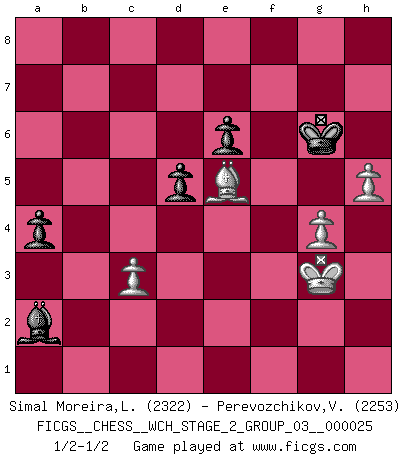 Last move : 1/2-1/2 2023 January 7 15:24:42 [Event "FICGS__CHESS__WCH_STAGE_2_GROUP_03__000025"] [Site "FICGS"] [Date "2022.11.15"] [Round "1"] [White "Simal Moreira,Leonardo"] [Black "Perevozchikov,Vjacheslav"] [Result "1/2-1/2"] [WhiteElo "2322"] [BlackElo "2253"] 1.e4 e6 2.d4 d5 3.Nc3 Nf6 4.e5 Nfd7 5.f4 c5 6.Nf3 Nc6 7.Be3 cxd4 8.Nxd4 Qb6 9.Qd2 Qxb2 10.Rb1 Qa3 11.Bb5 Nxd4 12.Bxd4 a6 13.Bxd7+ Bxd7 14.Rb3 Qe7 15.Rxb7 Rc8 16.O-O Qd8 17.Qe3 Rc4 18.Rfb1 Be7 19.f5 Bg5 20.Qd3 O-O 21.f6 Bc6 22.Re7 h6 23.g3 h5 24.h4 Bh6 25.Rb6 Qc8 26.fxg7 Bxg7 27.Ra7 Qd8 28.Rb3 Qc8 29.Rb6 Qd8 30.Rb3 Qc8 31.Kh2 Rd8 32.Ne2 Ba4 33.R3b7 Rd7 34.Rxd7 Bxd7 35.c3 Bb5 36.Qf3 Rc7 37.Rxc7 Qxc7 38.Nf4 Qa5 39.Qf2 Bc4 40.Nxh5 Qxa2 41.Qxa2 Bxa2 42.Nxg7 Kxg7 43.g4 a5 44.Bc5 f6 45.Bd4 fxe5 46.Bxe5+ Kg6 47.Kg3 a4 48.h5+ 1/2-1/2 Follow this game move after move (download)Nothing excites jaded Grandmasters more than a theoretical novelty. (Dominic Lawson) Auf Remis zu spielen ist gewissermaßen ein Verbrechen gegen das Schachspiel. (Mikhail Nekhemyevich Tal) a manera como él juega al Ajedrez, demuestra la completa naturaleza de un hombre. (Stanley Ellin) La vie et les Echecs sont tous les deux une lutte constante. (Lasker) Men should grow up. - Yeah. And dogs should stop licking themselves. It's not gonna happen. (Gregory House to Dr. Cameron, House M.D.)