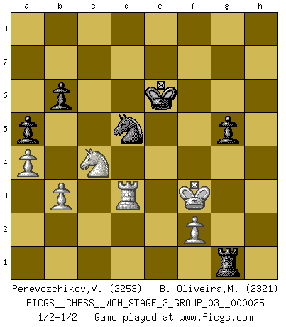 Last move : 1/2-1/2 2023 January 14 3:18:40 [Event "FICGS__CHESS__WCH_STAGE_2_GROUP_03__000025"] [Site "FICGS"] [Date "2022.11.15"] [Round "1"] [White "Perevozchikov,Vjacheslav"] [Black "B. Oliveira,Marcio"] [Result "1/2-1/2"] [WhiteElo "2253"] [BlackElo "2321"] 1.Nf3 d5 2.g3 Nf6 3.Bg2 g6 4.O-O Bg7 5.c4 dxc4 6.Qa4+ Nfd7 7.Qxc4 Nc6 8.Nc3 Nb6 9.Qh4 O-O 10.d3 e5 11.Bg5 f6 12.Bh6 Qe7 13.Bxg7 Kxg7 14.Rfd1 h5 15.Qe4 Bg4 16.d4 f5 17.Qe3 Bxf3 18.exf3 f4 19.Qe4 Rae8 20.dxe5 Qxe5 21.Rac1 h4 22.Qxe5+ Nxe5 23.Ne2 fxg3 24.Rxc7+ Rf7 25.Rxf7+ Nxf7 26.Nc3 gxh2+ 27.Kxh2 Ng5 28.Rd4 Rf8 29.Rxh4 Nxf3+ 30.Bxf3 Rxf3 31.Kg2 Rd3 32.Rb4 Rd7 33.Kg3 Nc8 34.Ne4 b6 35.Rc4 Ne7 36.Kg4 Nd5 37.b3 Ne7 38.Kf4 Kf7 39.Rc2 Nd5+ 40.Kg4 Re7 41.Nd6+ Kf6 42.Nb5 a5 43.Rd2 Re5 44.Nd6 Ke6 45.Nc4 Re4+ 46.Kf3 Rf4+ 47.Kg3 Re4 48.a4 Re1 49.Rd3 Rg1+ 50.Kf3 g5 51.Rd2 Rb1 52.Rd3 Rg1 53.Rd2 Rb1 54.Rd3 Rg1 1/2-1/2 Follow this game move after move (download)If you aren't afraid of Spassky, then I have removed the element of money. (Jim Slater) Gegen einen Schachcomputer zu verlieren ist wie Löcher in den Strümpfen zuhaben. Es ist nicht peinlich, solange man der einzige ist der es weiß. (Anonymous) Debemos de asegurarnos de que el Ajedrez no se convierta en un lenguaje muerto, muy interesante, pero tan solo para un grupo muy pequeño. (Sytze Faber) 'L'échange des dames est un coup dur pour les deux adversaires...' Un journaliste lors d'une partie du match Spassky-Fischer It's not the size of the dog in the fight, it's the size of the fight in the dog. (Mark Twain)