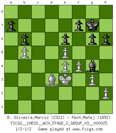 Last move : 1/2-1/2 2023 May 2 3:27:54 [Event "FICGS__CHESS__WCH_STAGE_2_GROUP_03__000025"] [Site "FICGS"] [Date "2022.11.15"] [Round "1"] [White "B. Oliveira,Marcio"] [Black "Pech,Matej"] [Result "1/2-1/2"] [WhiteElo "2321"] [BlackElo "1892"] 1.Nf3 Nf6 2.d4 d5 3.c4 c6 4.Nc3 e6 5.Bg5 h6 6.Bxf6 Qxf6 7.e3 Nd7 8.Be2 dxc4 9.O-O Bd6 10.Nd2 Bc7 11.Nxc4 O-O 12.Rc1 Qe7 13.Qc2 Rd8 14.g3 Rb8 15.Rfd1 Nf6 16.Ne5 Bd7 17.Na4 Be8 18.Nc5 Bxe5 19.dxe5 Nd7 20.Nd3 c5 21.Qc3 b6 22.f4 Nf8 23.Nf2 Bc6 24.Rxd8 Rxd8 25.b4 Bd5 26.a3 cxb4 27.axb4 Bb7 28.Ra1 Rc8 29.Qd2 Rd8 30.Qc3 Rc8 31.Qd2 Rd8 32.Bd3 Ra8 33.b5 Nd7 34.Ne4 Nc5 35.Nxc5 Qxc5 36.Bf1 Bd5 37.Kf2 g6 38.Ra4 Bb3 39.Rd4 Rc8 40.Be2 Kg7 41.Qb2 Qc2 42.Qxc2 Rxc2 43.Rb4 Rc3 44.Rd4 Rc2 45.Rb4 Rc3 46.e4 Bc2 47.Ke1 Ra3 48.Kd2 Ra4 49.Rxa4 Bxa4 50.Bd3 Bb3 51.Kc3 Bd1 52.Kd2 Bg4 53.Ke3 1/2-1/2 Follow this game move after move (download)It is no time to be playing Chess when the house is on fire. (Italian Proverb) Schach ist ein schwarz-weisser Dschungel. (Garry Kasparov) El Ajedrez es sobre todo, ¡una pelea!. (Emanuel Lasker) Ce n'est pas pour s'amuser qu'il joue aux échecs : il célèbre un culte. (Vladimir Nabokov) You cannot beat a roulette table unless you steal money from it. (Albert Einstein)