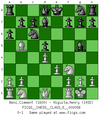 Last move : 0-1 2007 October 6 5:47:11 [Event "FICGS__CHESS__CLASS_E__000058"] [Site "FICGS"] [Date "2007.08.17"] [Round "1"] [White "Beni,Clement"] [Black "Higuita,Henry"] [Result "0-1"] [WhiteElo "1600"] [BlackElo "1432"] 1.d4 d5 2.Nf3 Nc6 3.c4 e6 4.Bg5 Be7 5.e3 Bxg5 6.cxd5 exd5 7.Bb5 Bd7 8.O-O a6 0-1 This chess game has been lost on time (started : 2007.08.17 4:41:10) Queen's pawn game, Chigorin variation Kingside Castling by player White (move 8) Player Black won this chess game. Follow this game move after move (download)Weak points or holes in the opponent's position must be occupied by pieces not Pawns. (Siegbert Tarrasch) Zu meiner Zeit war ein 20 jähriger ein junger Spieler, heute ist er ein Veteran. (Garry Kasparov) Si pudieramos observar el interior de la cabeza de un jugador de Ajedrez, encontraríamos ahí un mundo lleno de sentimientos, imágenes, ideas, emoción y pasión. (Alfred Binet) Votre seul travail dans les ouvertures est d'obtenir un milieu de partie jouable. (Lajos Portish) Quotation,n.: The act of repeating erroneously the words of another. The words erroneously repeated. (Ambrose Bierce, The Devil's Dictionary)