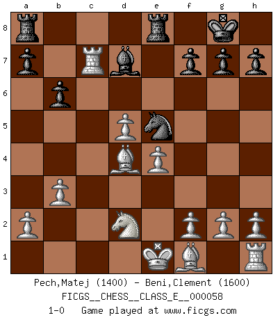 Last move : 1-0 2008 January 28 12:7:0 [Event "FICGS__CHESS__CLASS_E__000058"] [Site "FICGS"] [Date "2007.08.17"] [Round "1"] [White "Pech,Matej"] [Black "Beni,Clement"] [Result "1-0"] [WhiteElo "1400"] [BlackElo "1600"] 1.d4 d5 2.c4 Nf6 3.Nf3 e5 4.dxe5 Ne4 5.Qxd5 Qxd5 6.cxd5 Bb4+ 7.Nbd2 Bxd2+ 8.Nxd2 Nc5 9.b3 O-O 10.Ba3 Nbd7 11.Rc1 b6 12.e4 Nxe5 13.Bxc5 Re8 14.Bd4 Bd7 15.Rxc7 1-0 This chess game has been lost on time (started : 2007.08.17 4:41:10) QGD : Marshall defense Kingside Castling by player Black (move 9) Player White won this chess game. Follow this game move after move (download)If one piece is badly posted, the whole game is bad. (Tarrasch) Je mehr wir mit Computern analysieren, desto mehr glauben wir an Verteidigung. (Vladimir Kramnik) Bobby Fischer es el mas grande genio de Ajedrez de todos los tiempos. (Alexander Kotov) C'est la seule position que je connaisse où les deux camps sont mals. Propos prêtés à V. Anand. Success without honor is an unseasoned dish; it will satisfy your hunger, but it won't taste good. (Joe Paterno)