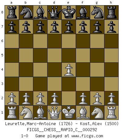 Last move : 1-0 2022 December 16 15:40:5 [Event "FICGS__CHESS__RAPID_C__000292"] [Site "FICGS"] [Date "2022.11.16"] [Round "1"] [White "Leurette,Marc-Antoine"] [Black "Kost,Alex"] [Result "1-0"] [WhiteElo "1726"] [BlackElo "1500"] 1.e4 1-0 This chess game has been lost on time (started : 2022.11.16 2:2:7) Follow this game move after move (download)At this time Fischer is simply a level above all the best Chessplayers in the world. (John Jacobs) Ich habe Kasparov in Rente geschickt. (Veselin Topalov) El Jaque al descubierto es el bombardero del tablero. (Reuben Fine) Psychologiquement, tu dois avoir confiance en toi même, mais cette confiance doit être basée sur des faits. (Robert Fischer) Do you know these so called Volunteers don't even get paid! (Simpsons)