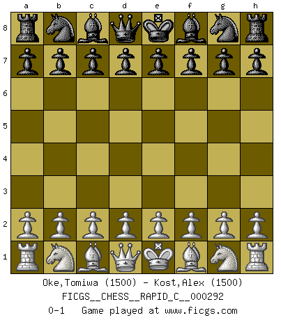 Last move : 0-1 2022 December 16 15:40:5 [Event "FICGS__CHESS__RAPID_C__000292"] [Site "FICGS"] [Date "2022.11.16"] [Round "1"] [White "Oke,Tomiwa"] [Black "Kost,Alex"] [Result "0-1"] [WhiteElo "1500"] [BlackElo "1500"] 0-1 This chess game has been lost on time (started : 2022.11.16 2:2:7) Follow this game move after move (download)Chess is in its essence a game, in its form an art, and in its execution a science. (Baron Tassilo) Zu meiner Zeit war ein 20 jähriger ein junger Spieler, heute ist er ein Veteran. (Garry Kasparov) La caracteristica mas importante en la posición del Ajedrez es la actividad de las piezas. Esto es absolutamente fundamental en todas las fases del juego: Apertura, Juego Medio y especialmente Finales. La limitación primordial en la actividad de una pieza, es la estructuración de los Peones. (Michael Stean) Je fais ceci parce que dans cinquante coups j'obtiendrai cela; je m'appelle Mikhail Moisevitch Botvinnik. (Botvinnik) Whatever you do, don't be bored. This is absolutely the most exciting time we could have possibly hoped to be alive. And things are just starting. (From movie Waking life)