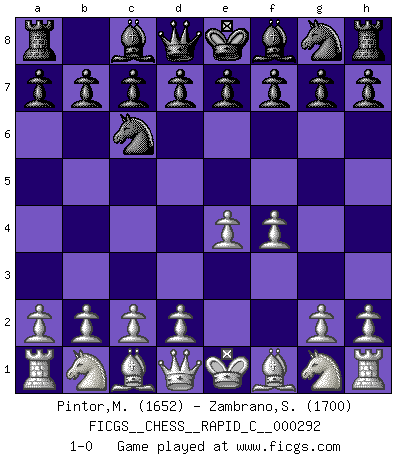 Last move : 1-0 2022 December 17 10:43:28 [Event "FICGS__CHESS__RAPID_C__000292"] [Site "FICGS"] [Date "2022.11.16"] [Round "1"] [White "Pintor,Manuel"] [Black "Zambrano,Salvatore"] [Result "1-0"] [WhiteElo "1652"] [BlackElo "1700"] 1.e4 Nc6 2.f4 1-0 This chess game has been lost on time (started : 2022.11.16 2:2:7) Follow this game move after move (download)Chess is a terrible game. If you have no center, your opponent has a freer position. If you do have a center, then you really have something to worry about ! (Siegbert Tarrasch) Stelle das Brett so, daß die Sonne in die Augen deines Gegners scheint. (Ruy López) Nunca antes ha habido un jugador de Ajedrez con tal conocimiento a fondo de las complejidades del juego y una inmensa voluntad absolutamente indomable de ganar. Yo pienso que Fischer es el jugador mas grande que jamás haya existido. (Lisa Lane) Je crois qu'il existe des manières très spécifiques de jouer efficacement contre une machine. Evidemment, nous n'avons aucune chance en technique pure, parce que l'ordinateur calcule de manière parfaite. Mais lorsque nous faisons appel à notre cerveau, en utilisant l'intuition et la compréhension, alors nous restons beaucoup plus forts. (Anatoli Karpov) A good teacher is like a candle - it consumes itself to light the way for others. (Author unknown)