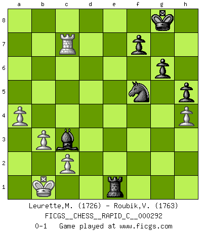Last move : 0-1 2022 December 8 14:43:15 [Event "FICGS__CHESS__RAPID_C__000292"] [Site "FICGS"] [Date "2022.11.16"] [Round "1"] [White "Leurette,Marc-Antoine"] [Black "Roubik,Vit"] [Result "0-1"] [WhiteElo "1726"] [BlackElo "1763"] 1.e4 c5 2.Nc3 d6 3.Nf3 Nc6 4.Bc4 g6 5.d3 Bg7 6.Be3 Nf6 7.Qd2 O-O 8.O-O-O Bg4 9.h3 Bxf3 10.gxf3 e6 11.h4 d5 12.exd5 exd5 13.Bxc5 dxc4 14.dxc4 Qxd2+ 15.Rxd2 Rfc8 16.Be3 Ne5 17.f4 Nxc4 18.Rd3 Nxe3 19.fxe3 h5 20.Rhd1 Ng4 21.Rd7 Nxe3 22.R1d3 Bh6 23.Rxb7 Re8 24.b3 Bxf4 25.Kb2 Nf5 26.R3d7 Be5 27.Rxa7 Rxa7 28.Rxa7 Rc8 29.a4 Bxc3+ 30.Kb1 Re8 31.Rc7 Re1+ 0-1 Follow this game move after move (download)Chess is a part of culture and if a culture is declining then Chess too will decline. (Mikhail Botvinnik) Ich würde mich als ganz normalen Jungen bezeichnen [Im Alter von 12]. (Sergej Karjakin) Si un gobernante no entiende al Ajedrez, ¿como puede governar él un reinado?. (El Rey Khusros II) Avec des compensations pour le matériel en plus... (Anonyme) If you don't practice you don't deserve to win. (Andre Agassi)
