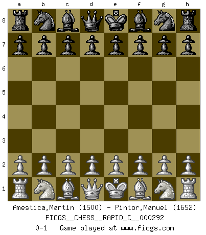 Last move : 0-1 2022 December 16 15:40:5 [Event "FICGS__CHESS__RAPID_C__000292"] [Site "FICGS"] [Date "2022.11.16"] [Round "1"] [White "Amestica,Martin"] [Black "Pintor,Manuel"] [Result "0-1"] [WhiteElo "1500"] [BlackElo "1652"] 0-1 This chess game has been lost on time (started : 2022.11.16 2:2:7) Follow this game move after move (download)Whoever sees no other aim in the game than that of giving checkmate to one's opponent will never become a good Chess player. (Euwe) Ich war schon mal beim Dopingtest. Da musste ich Urin abgeben, während Dritte zusahen. (Elisabeth Pähtz) El Ajedrez es una guerra en un tablero. El objetivo es aplastar la mente del oponente. (Bobby Fischer) Il s'avisa de me proposer d'apprendre les échecs qu'il jouait un peu... me voilà forcené des échecs. J'achète un échiquier, je m'enferme dans ma chambre, j'y passe des jours et des nuits à vouloir apprendre par cur toutes les parties. (Jean-Jacques Rousseau, Confessions) It's not the size of the dog in the fight, it's the size of the fight in the dog. (Mark Twain)