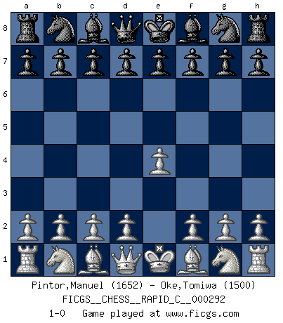 Last move : 1-0 2022 December 16 15:40:5 [Event "FICGS__CHESS__RAPID_C__000292"] [Site "FICGS"] [Date "2022.11.16"] [Round "1"] [White "Pintor,Manuel"] [Black "Oke,Tomiwa"] [Result "1-0"] [WhiteElo "1652"] [BlackElo "1500"] 1.e4 1-0 This chess game has been lost on time (started : 2022.11.16 2:2:7) Follow this game move after move (download)I'm not a materialistic person, in that, I don't suffer the lack or loss of money. The absence of worldly goods I don't look back on. For Chess is a way I can be as materialistic as I want without having to sell my soul. (Jamie Walter Adams) Modernes Schach erfordert enorme Anspannung. Es ist für einen normalen Menschen unmöglich das auszuhalten. (Viktor Kortschnoi) El Ajedrez es una hermosa aventura. (Bent Larsen) Des points faibles ou des trous dans la position de l'adversaire doivent être occupés par des pièces et non pas par des pions. (Siegbert Tarrasch) Memory... is the diary that we all carry with us. (Oscar Wilde, The Importance of Being Earnest)