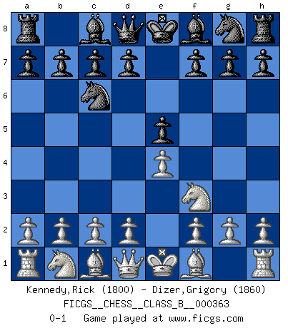 Last move : 0-1 2022 December 28 13:27:15 [Event "FICGS__CHESS__CLASS_B__000363"] [Site "FICGS"] [Date "2022.11.17"] [Round "1"] [White "Kennedy,Rick"] [Black "Dizer,Grigory"] [Result "0-1"] [WhiteElo "1800"] [BlackElo "1860"] 1.e4 e5 2.Nf3 Nc6 0-1 This chess game has been lost on time (started : 2022.11.17 20:46:31) Follow this game move after move (download)Discovered check is the dive bomber of the Chessboard. (Reuben Fine) Ich habe die besten Aussichten, den ersten Preis zu gewinnen - denn jeder muss gegen Steinitz spielen, nur ich nicht! (Wilhelm Steinitz) Todavía soy una víctima del Ajedrez. Tiene toda la belleza del arte y mucho mas. No puede ser comercializado. El Ajedrez es mas puro que el arte en su posición social. (Marcel Duchamp) Même un GMI sait rarement calculer sur plus de cinq coups une attaque à sacrifices. (Rudolf Spielmann) Patience, use the Force, think ! (Obi-Wan Kenobi in Star Wars ep.2)